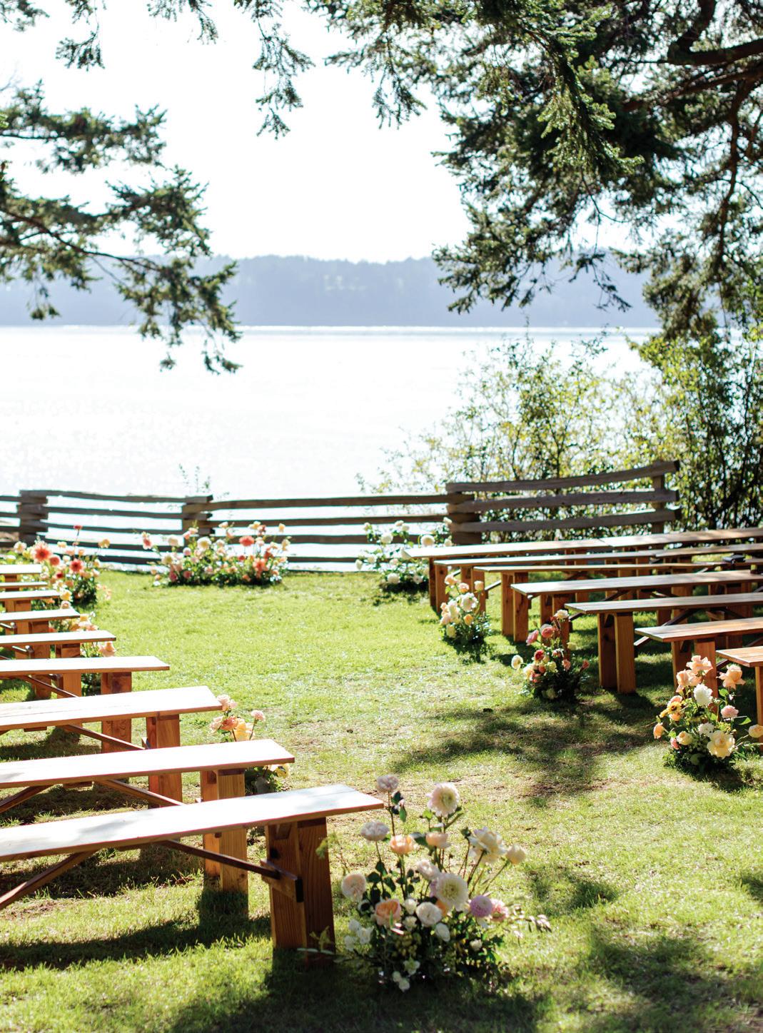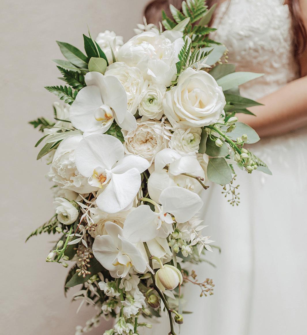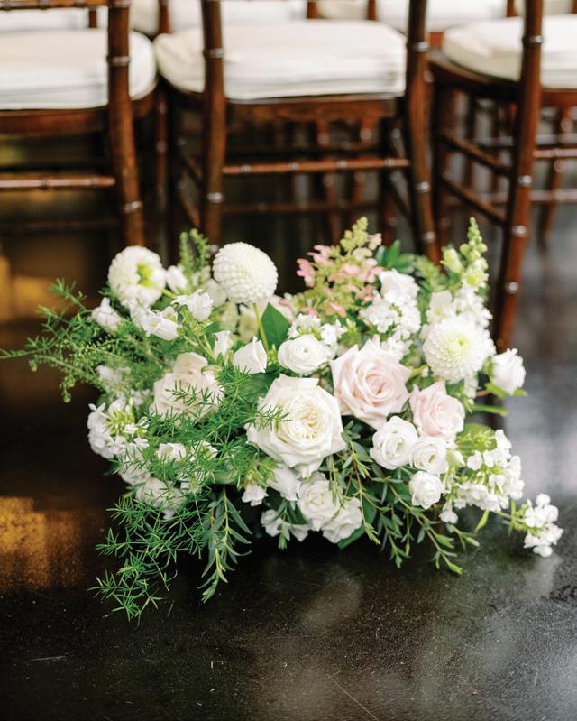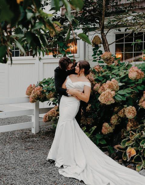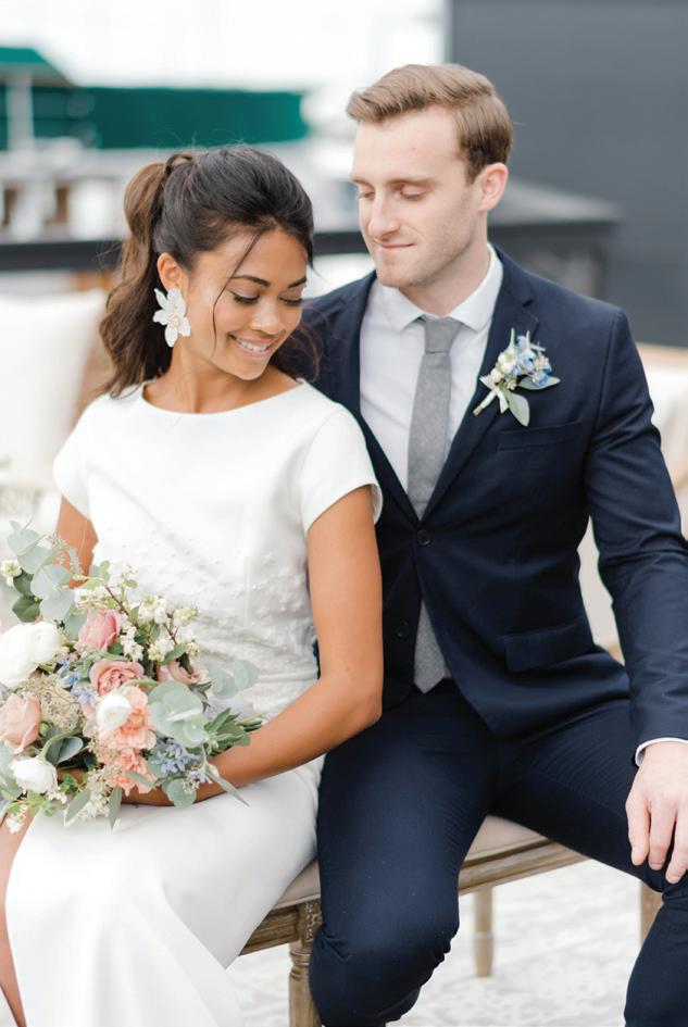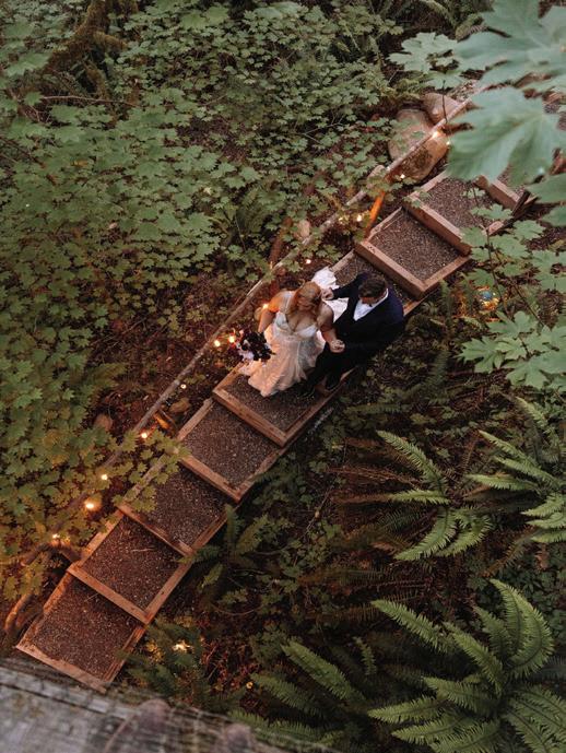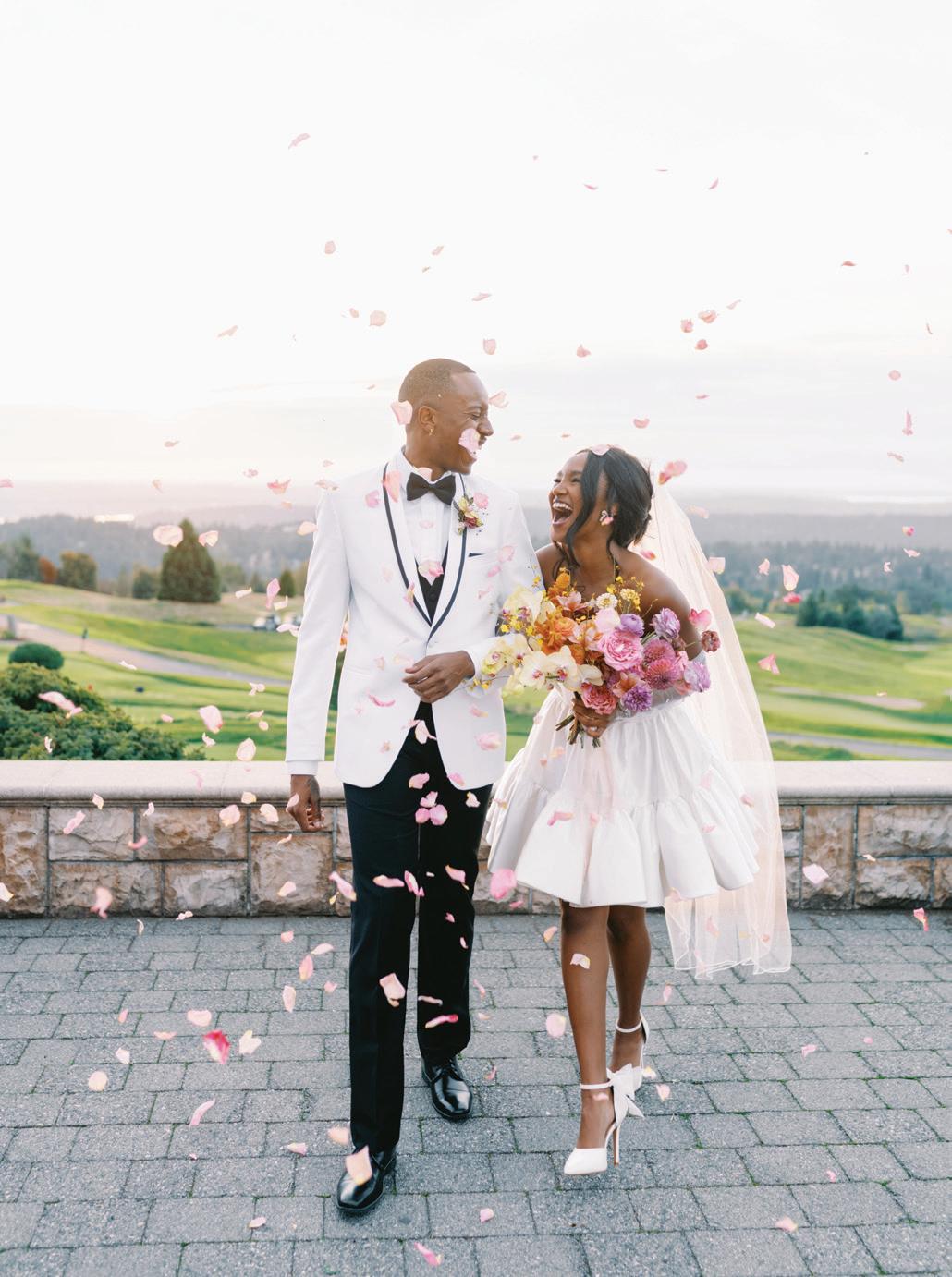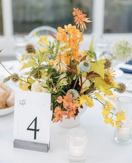 Fall was in the air at Brittany and Dustin’s October wedding in Seattle. Brittany’s vision board included a breathtaking view and a venue that would leave a lasting impression—as well as a refined approach to seasonal style. The Hyatt Regency Lake Washington was the perfect location, with its waterfront setting providing the ideal backdrop. Initially, Brittany was leaning toward traditional autumn-hued oranges, but the bright colors didn’t match her vision. A sense of elegance and timelessness was achieved with her choice of a soft palette of blush, cream, peach and ivory. Creamcolored pumpkins sprinkled with copper glitter along with navy accents and seasonal blue thistle added a contemporary touch to the autumn elements. The result was everything Brittany imagined: sophisticated, harmonious and perfectly suited for their fall celebration. —Laura Cross
