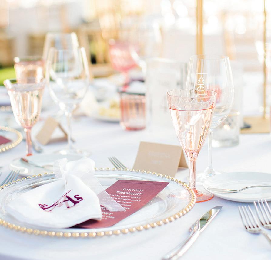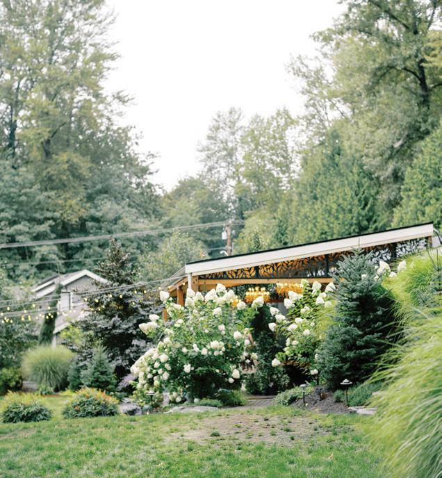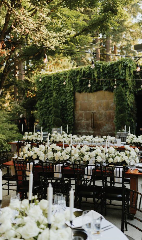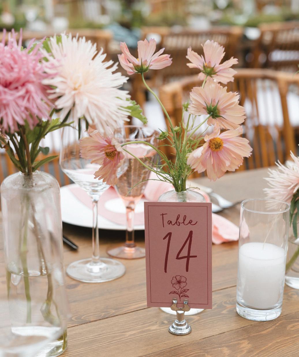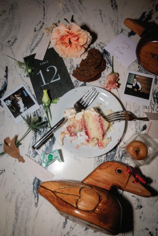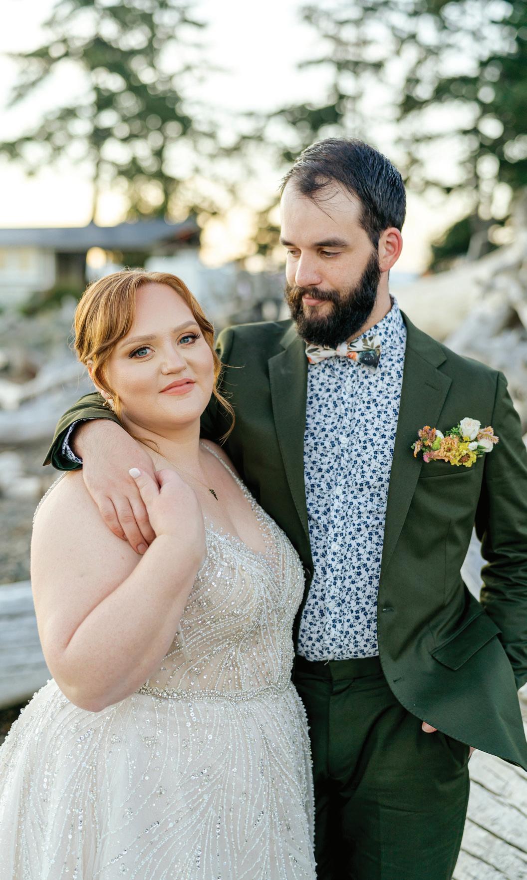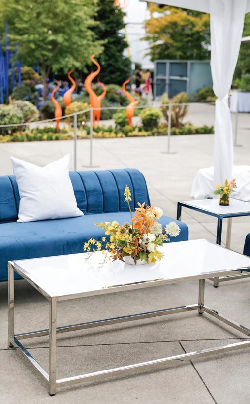 Fall was in the air at Brittany and Dustin’s October wedding in Seattle. Brittany’s vision board included a breathtaking view and a venue that would leave a lasting impression—as well as a refined approach to seasonal style. The Hyatt Regency Lake Washington was the perfect location, with its waterfront setting providing the ideal backdrop. Initially, Brittany was leaning toward traditional autumn-hued oranges, but the bright colors didn’t match her vision. A sense of elegance and timelessness was achieved with her choice of a soft palette of blush, cream, peach and ivory. Creamcolored pumpkins sprinkled with copper glitter along with navy accents and seasonal blue thistle added a contemporary touch to the autumn elements. The result was everything Brittany imagined: sophisticated, harmonious and perfectly suited for their fall celebration. —Laura Cross