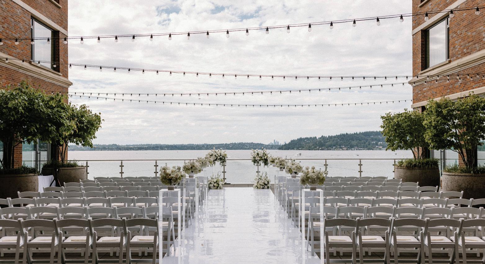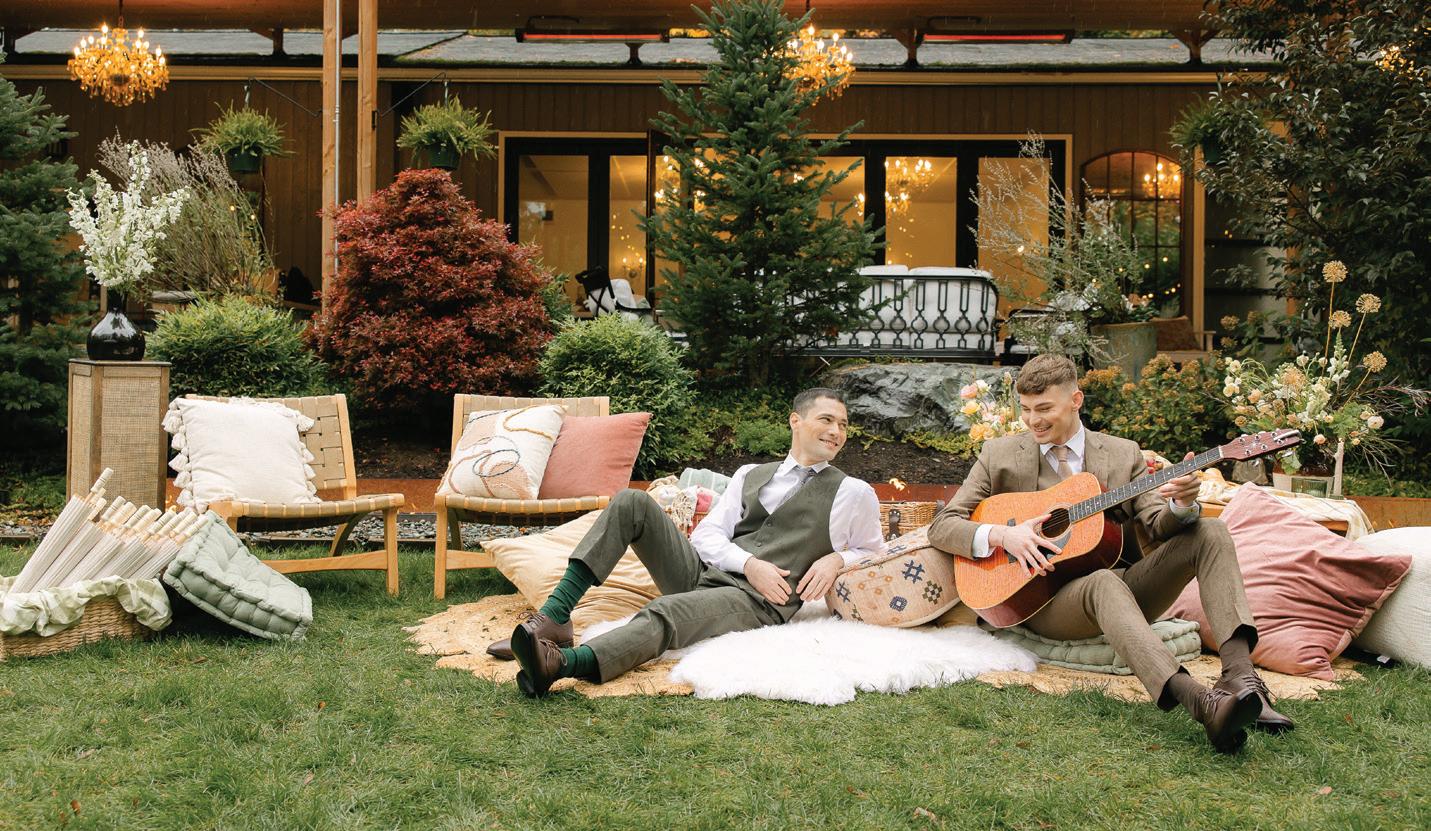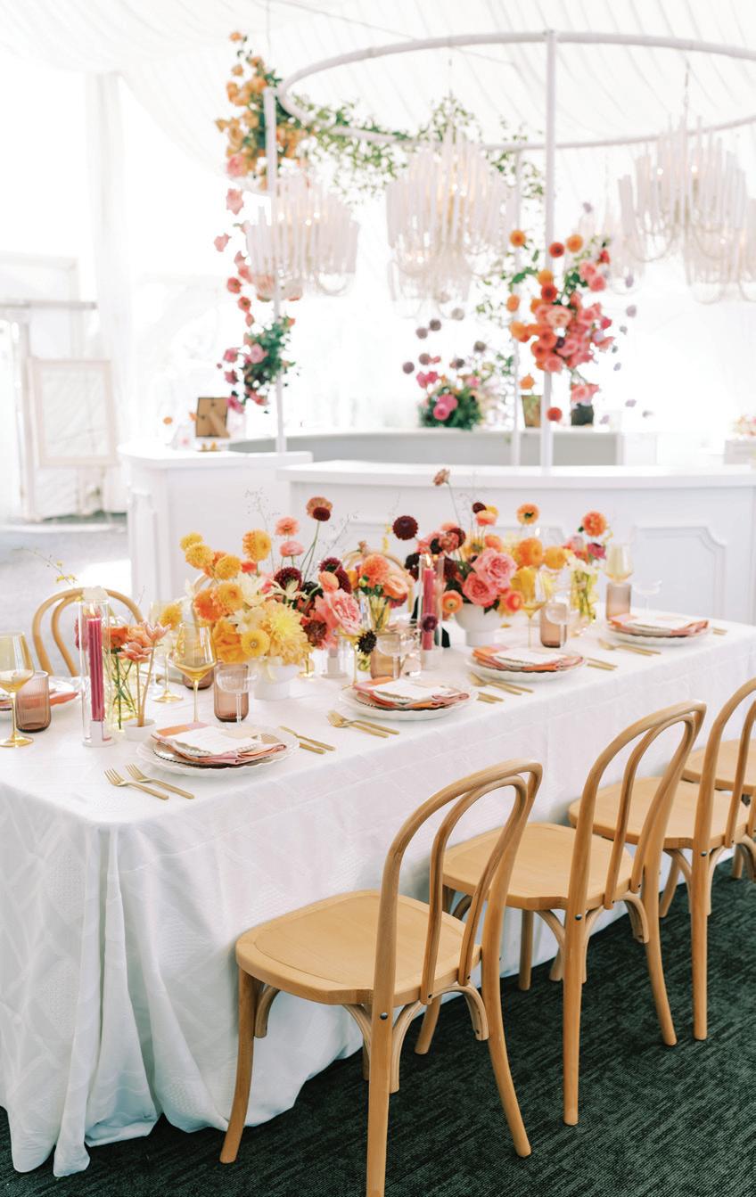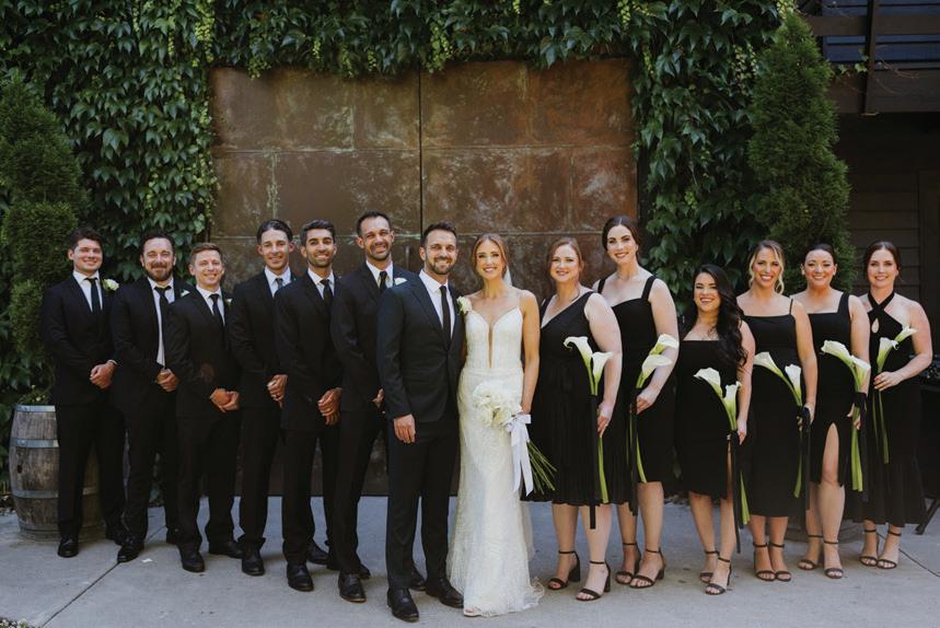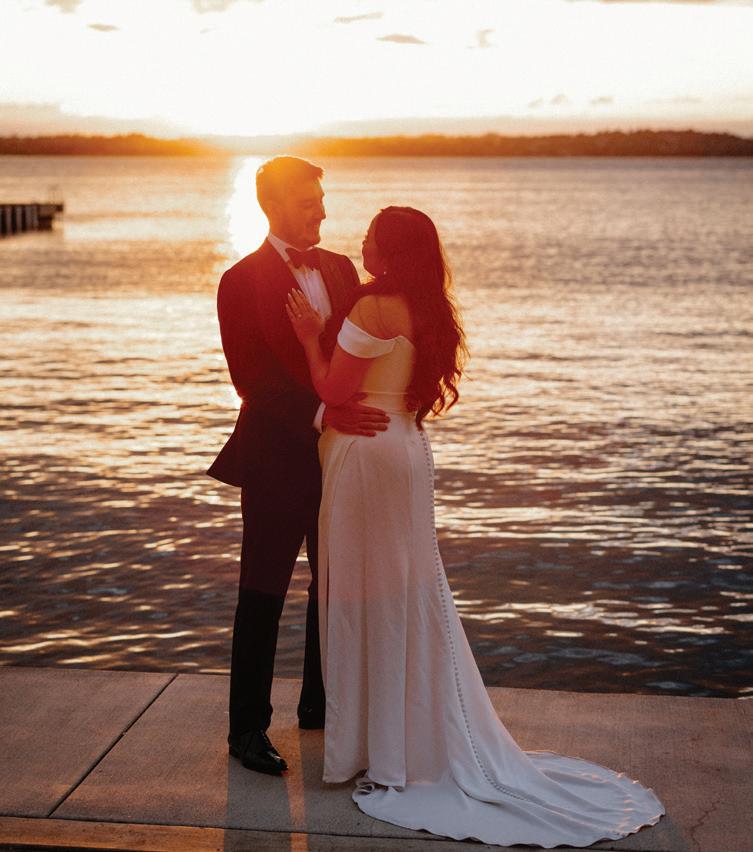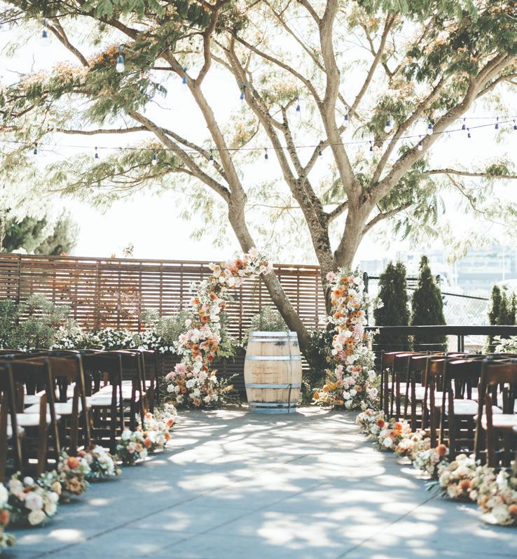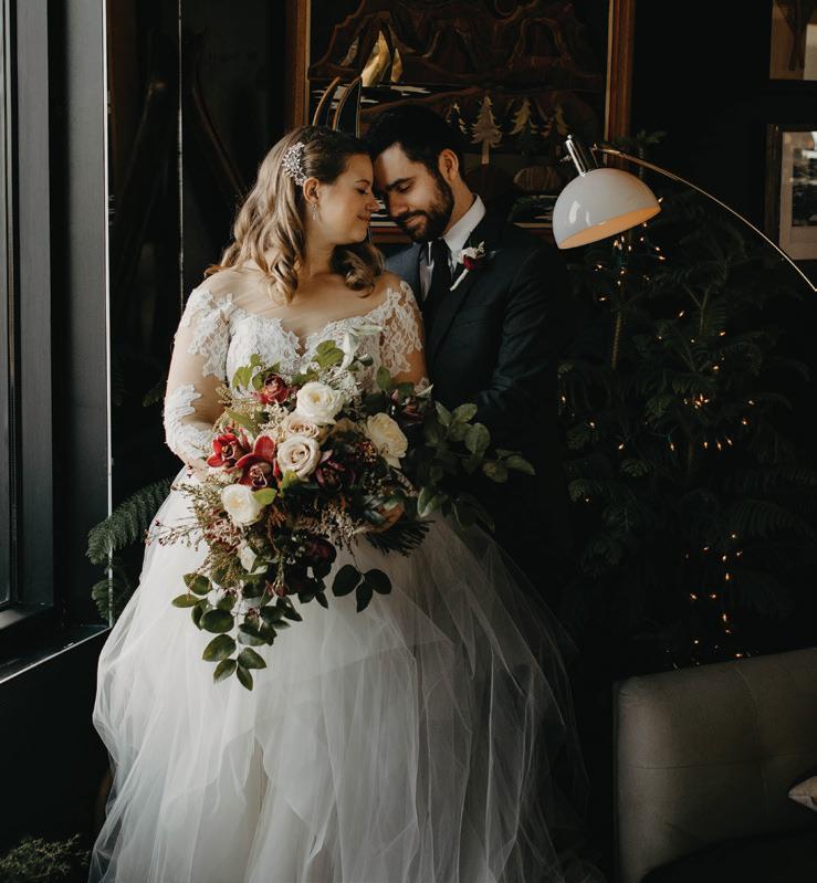 Fall was in the air at Brittany and Dustin’s October wedding in Seattle. Brittany’s vision board included a breathtaking view and a venue that would leave a lasting impression—as well as a refined approach to seasonal style. The Hyatt Regency Lake Washington was the perfect location, with its waterfront setting providing the ideal backdrop. Initially, Brittany was leaning toward traditional autumn-hued oranges, but the bright colors didn’t match her vision. A sense of elegance and timelessness was achieved with her choice of a soft palette of blush, cream, peach and ivory. Creamcolored pumpkins sprinkled with copper glitter along with navy accents and seasonal blue thistle added a contemporary touch to the autumn elements. The result was everything Brittany imagined: sophisticated, harmonious and perfectly suited for their fall celebration. —Laura Cross