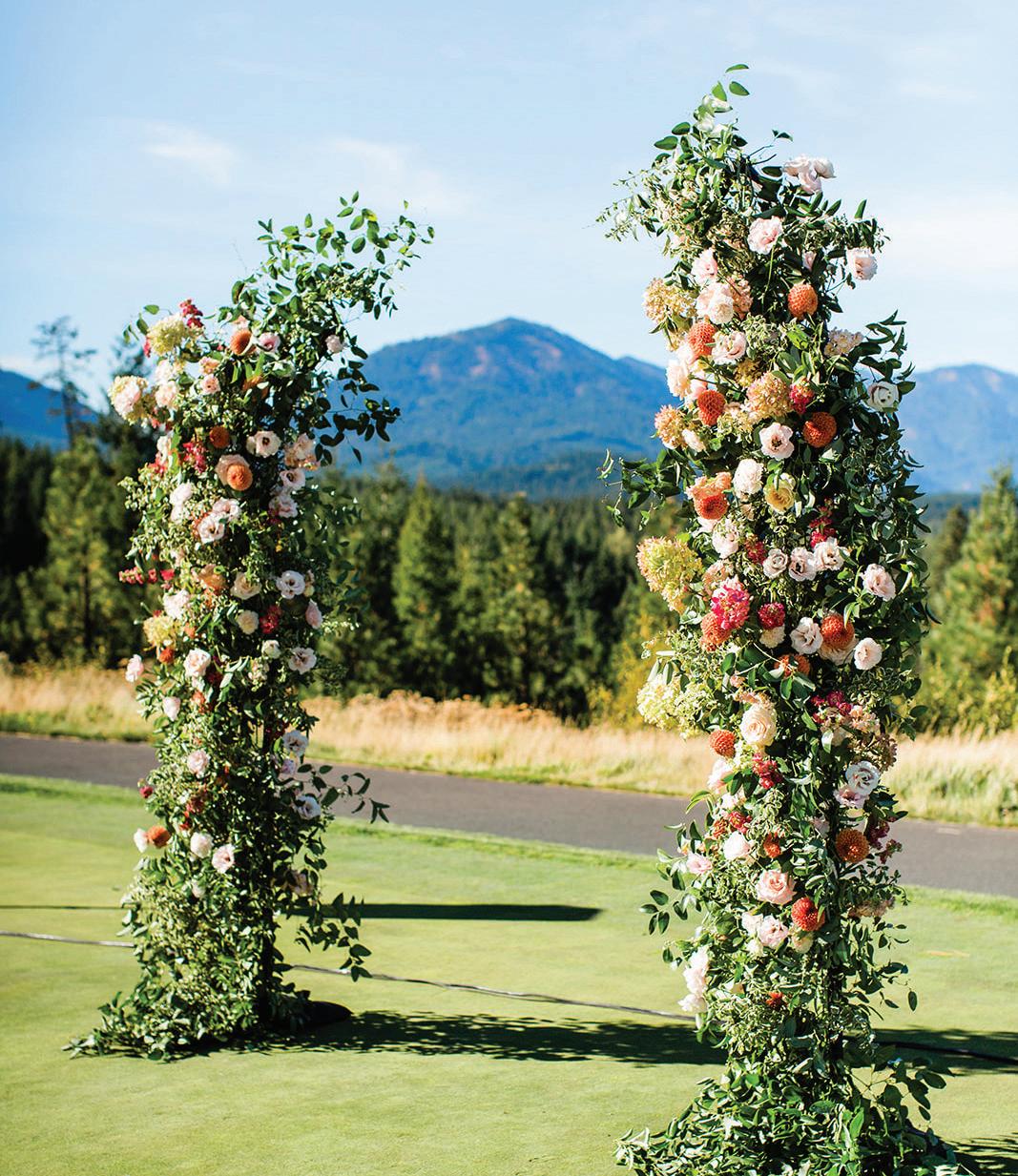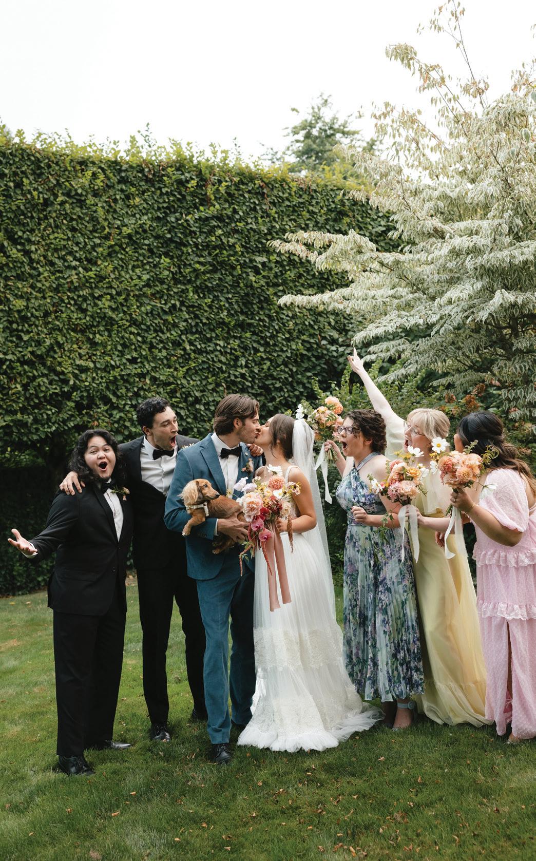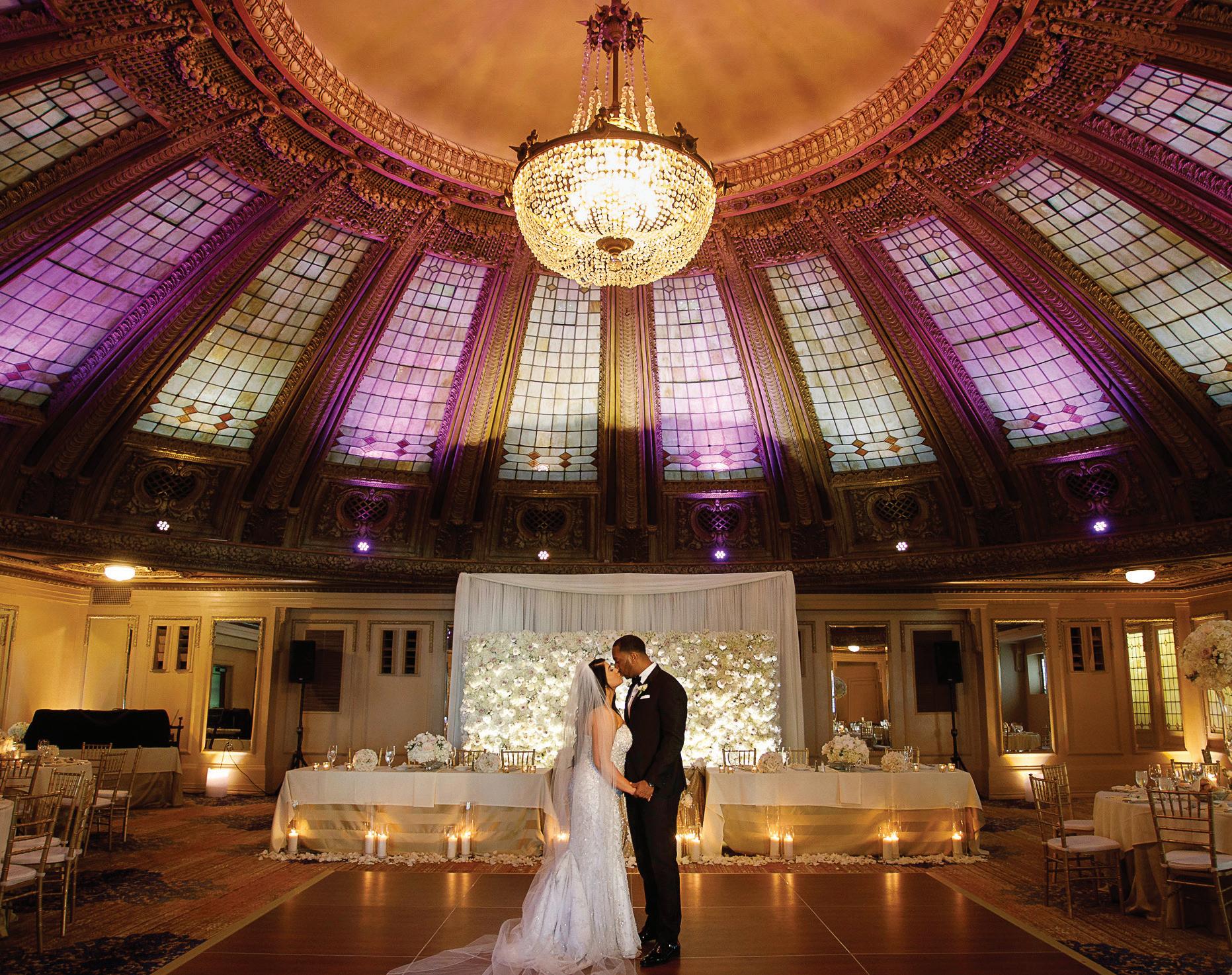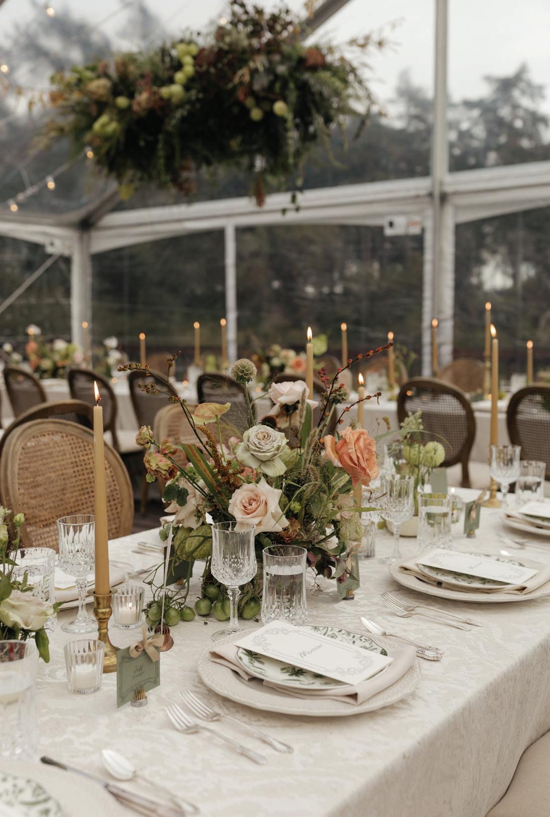 Fall was in the air at Brittany and Dustin’s October wedding in Seattle. Brittany’s vision board included a breathtaking view and a venue that would leave a lasting impression—as well as a refined approach to seasonal style. The Hyatt Regency Lake Washington was the perfect location, with its waterfront setting providing the ideal backdrop. Initially, Brittany was leaning toward traditional autumn-hued oranges, but the bright colors didn’t match her vision. A sense of elegance and timelessness was achieved with her choice of a soft palette of blush, cream, peach and ivory. Creamcolored pumpkins sprinkled with copper glitter along with navy accents and seasonal blue thistle added a contemporary touch to the autumn elements. The result was everything Brittany imagined: sophisticated, harmonious and perfectly suited for their fall celebration. —Laura Cross