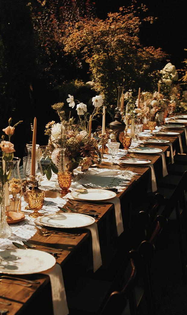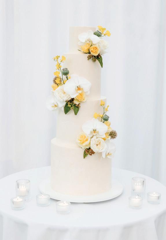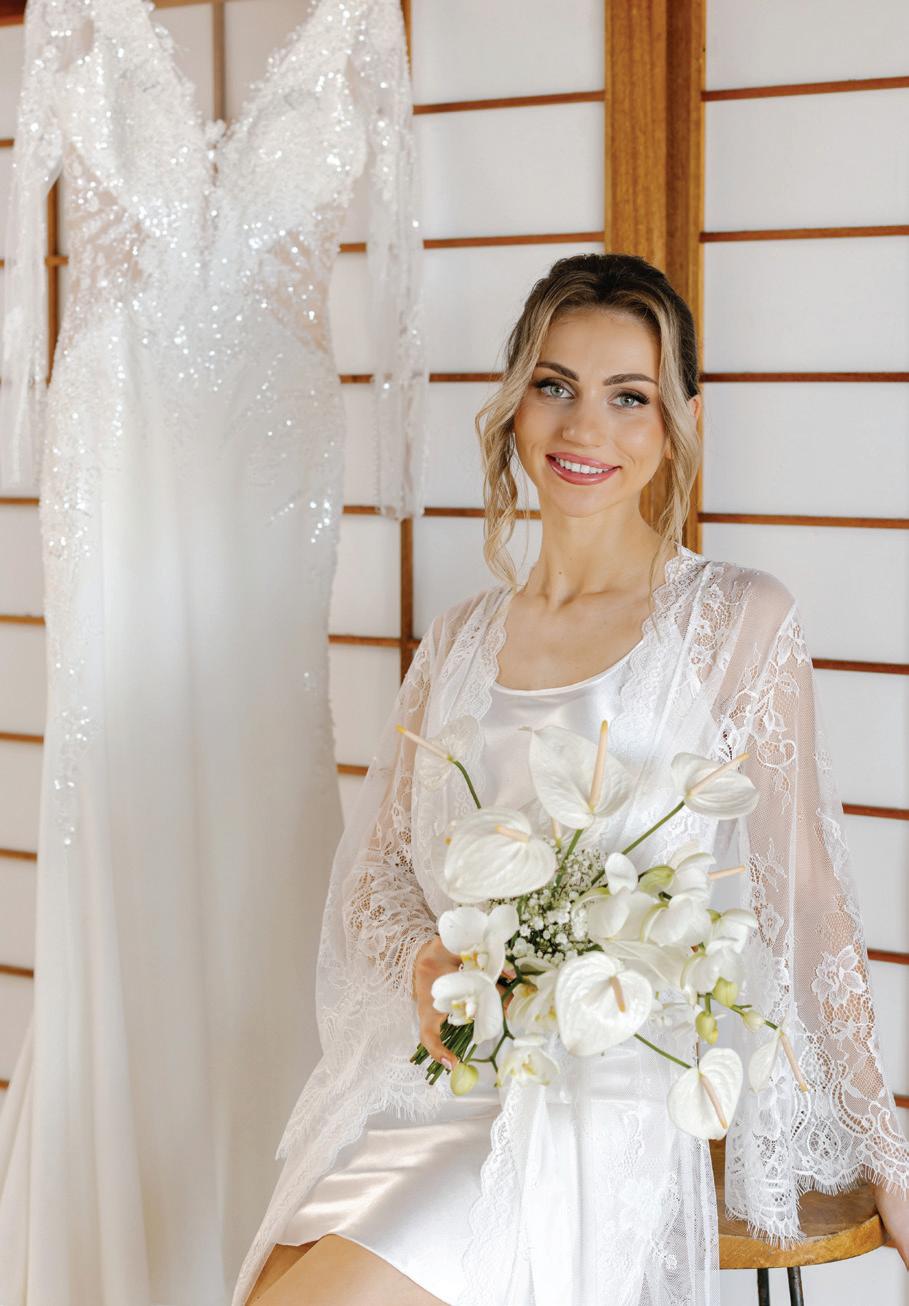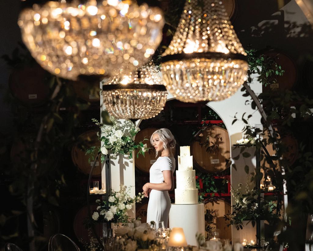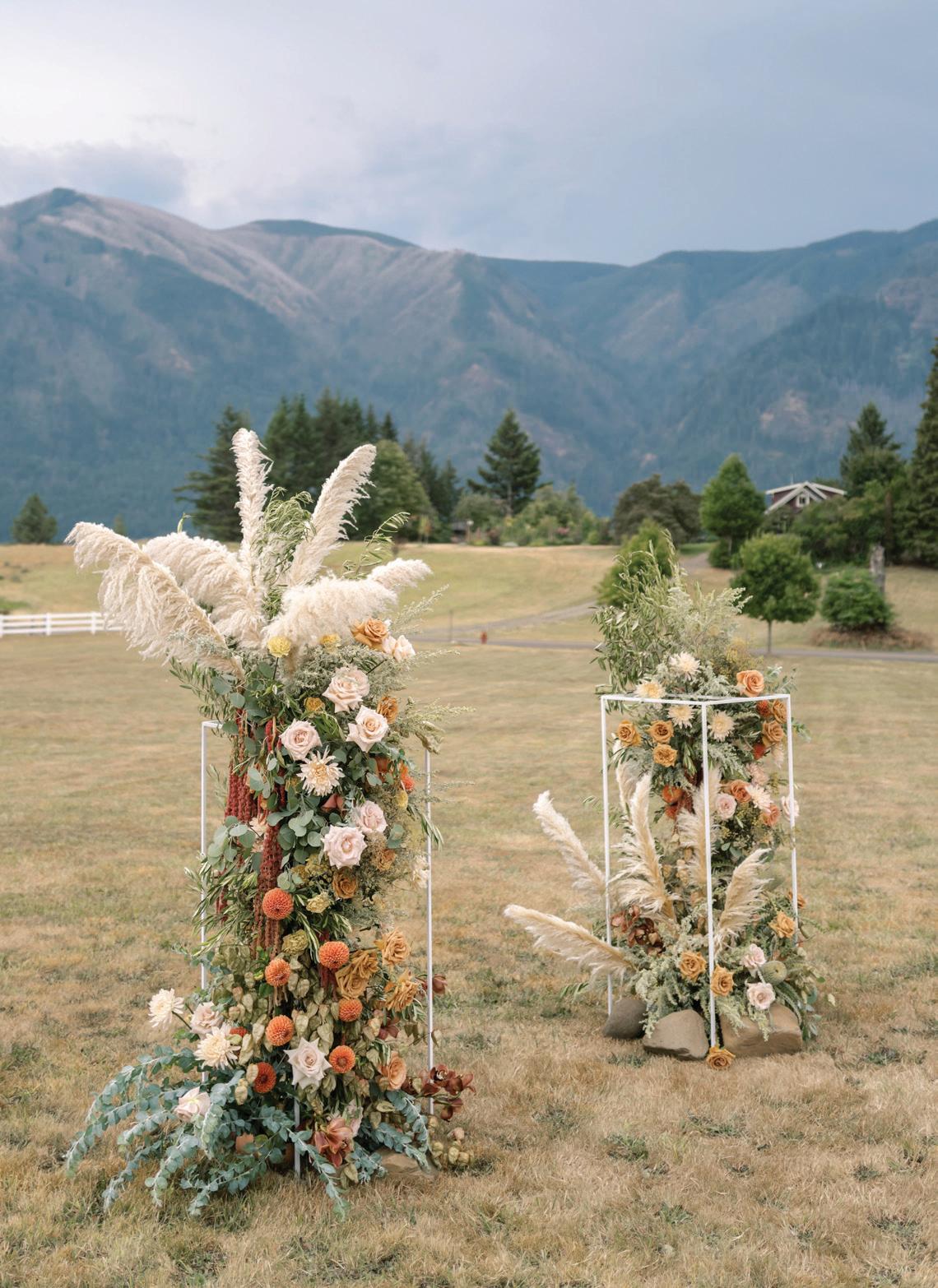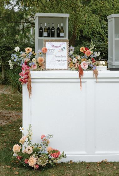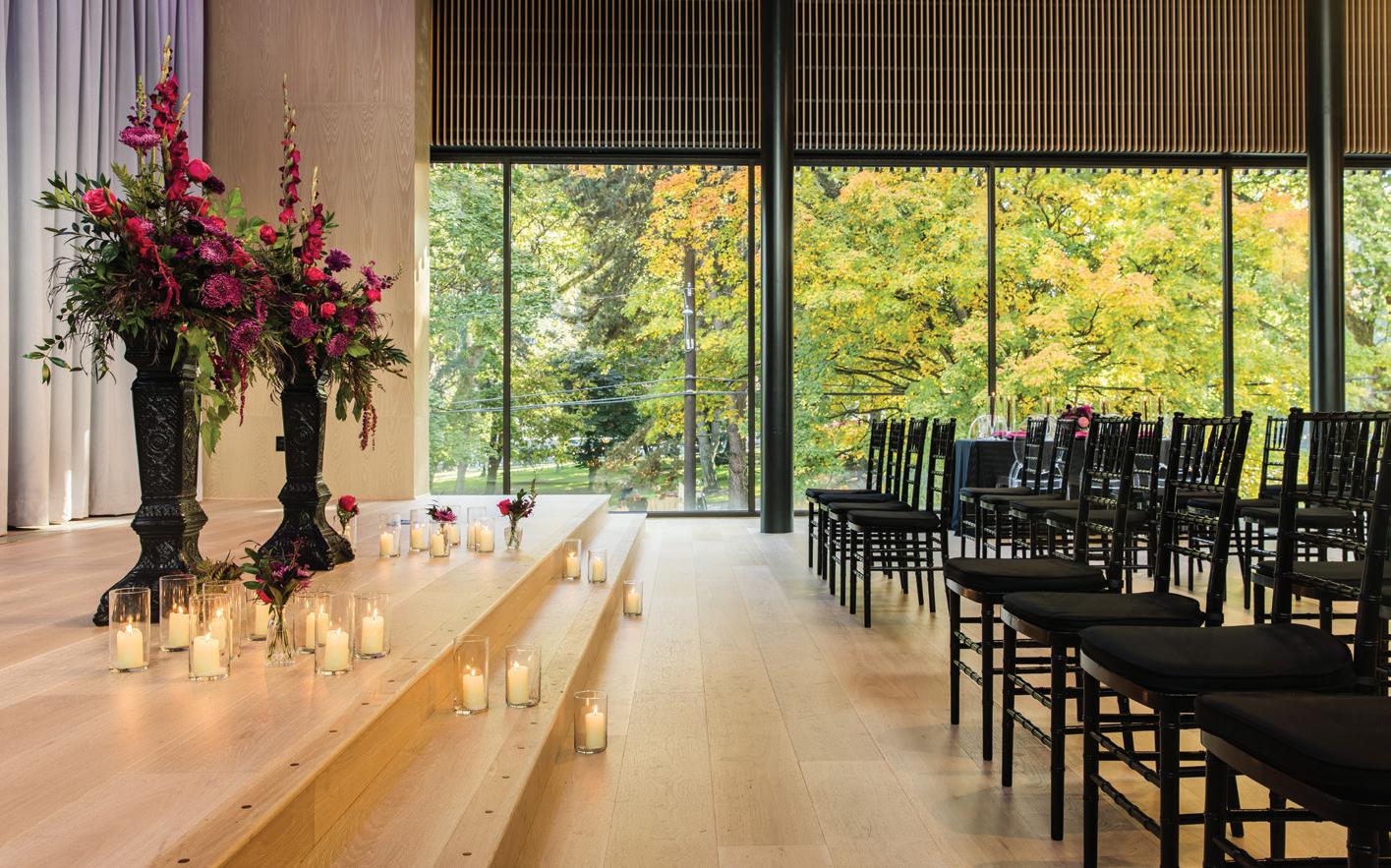 Fall was in the air at Brittany and Dustin’s October wedding in Seattle. Brittany’s vision board included a breathtaking view and a venue that would leave a lasting impression—as well as a refined approach to seasonal style. The Hyatt Regency Lake Washington was the perfect location, with its waterfront setting providing the ideal backdrop. Initially, Brittany was leaning toward traditional autumn-hued oranges, but the bright colors didn’t match her vision. A sense of elegance and timelessness was achieved with her choice of a soft palette of blush, cream, peach and ivory. Creamcolored pumpkins sprinkled with copper glitter along with navy accents and seasonal blue thistle added a contemporary touch to the autumn elements. The result was everything Brittany imagined: sophisticated, harmonious and perfectly suited for their fall celebration. —Laura Cross