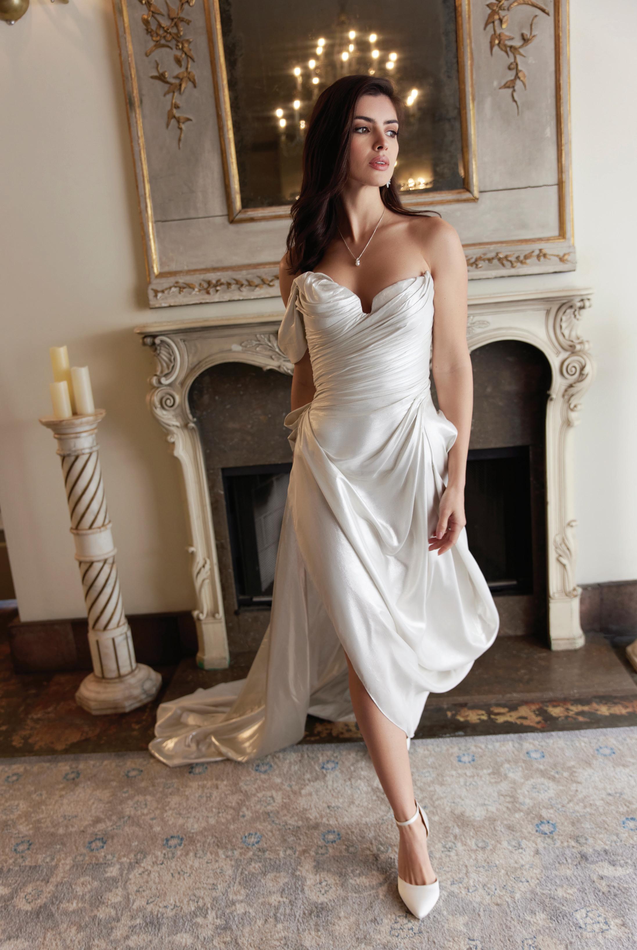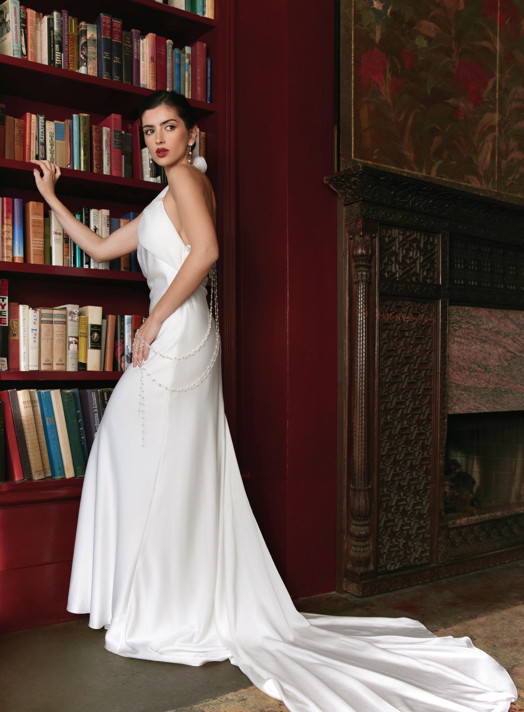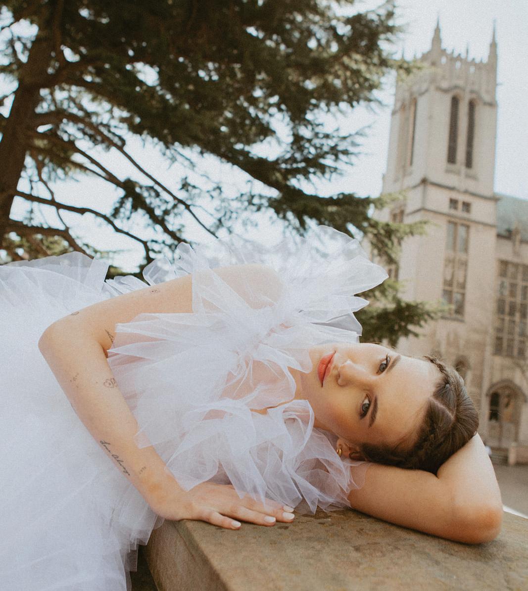 "Gidget" gown paired with the "Vincent" slip by Lola Varma, price upon request from The Dress Theory in Seattle. Baroque pearl long drop earrings by Freya Rose. Three-stone ring from Green Lake Jewelry. Hair and makeup by I.M. Artistry. Styled by Kimberly Douglass Blatt. Photography by Anastasia Mikhanoshina at The Ruins.