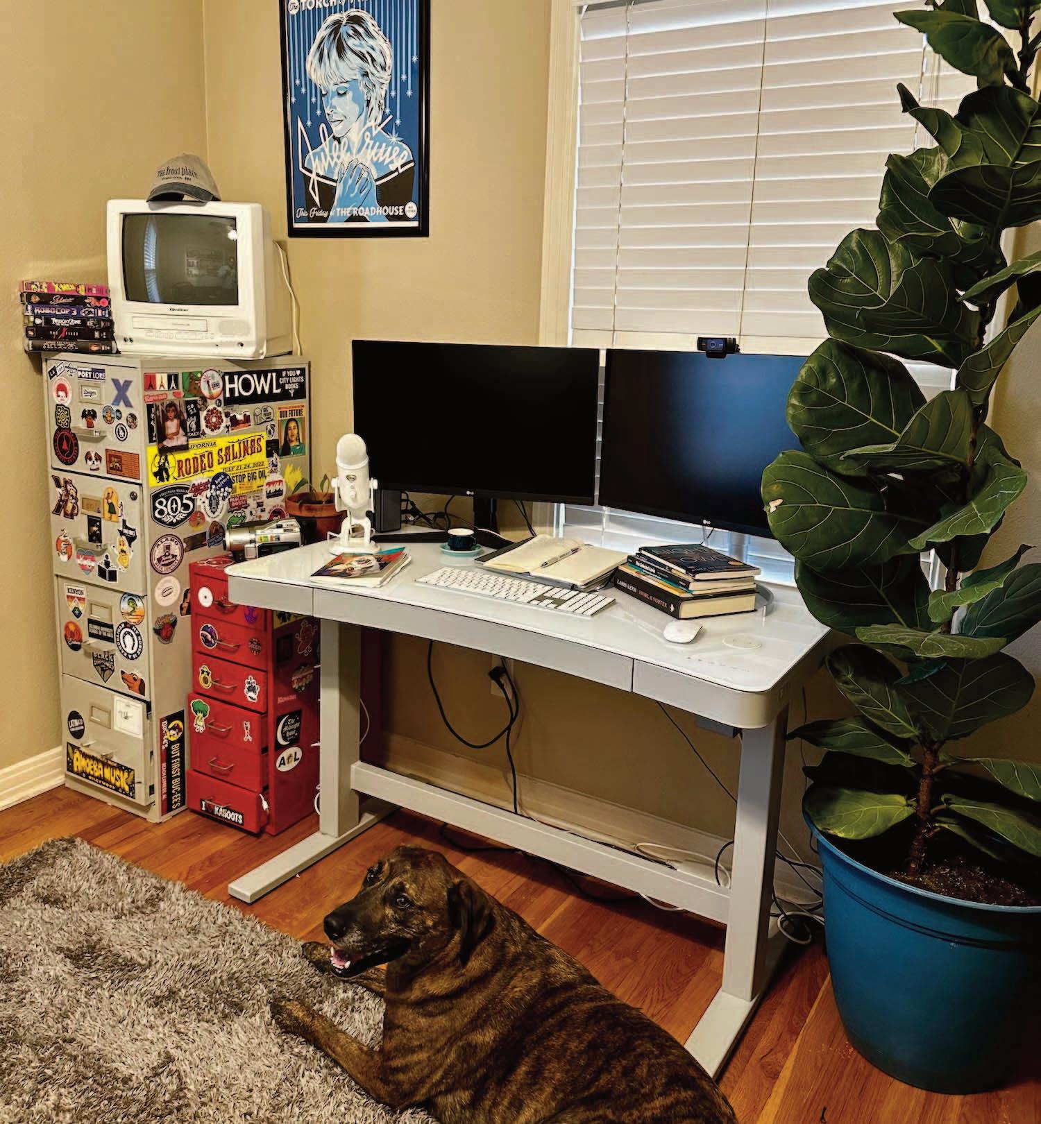 As a professor at Texas Tech University, Nathan Xavier Osorio is an encouraging mentor who hears and uplifts his students’ voices, celebrating the stories and styles that make their work unique. Osorio’s intentional practice of listening to the people and places around him also undergirds his debut poetry collection, Querida (U of Pittsburgh P, 2024). Melding personal with overheard dialogue, as well as Californian landscapes like the Mojave Desert and the San Gabriel Mountains with manmade highways, gas stations, and fast-food remnants, his poems are lyrical meditations on inheritance, migration, and capitalism. One look at Osorio’s writing desk exemplifies how voices and locations inspire his poems. Every item—books by other poets, a microphone for conducting interviews, a video camera for recording his encounters, movies for alternative perspectives, and a (very cute!) dog to encourage walking outside—facilitates his connections to the world beyond his office . . . and acts as example for all of us hoping to build the same communion.