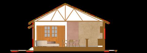 O terceiro corte mostra a copa e a sala de exposição, bem como a porta de principal de acesso do bangalô.