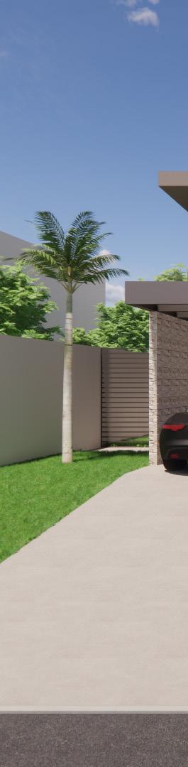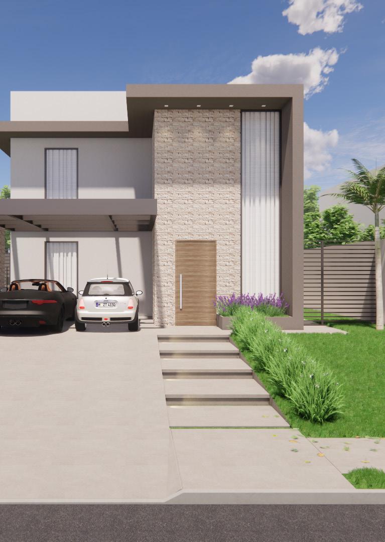 Organizado em pavimento térreo e pavimento supe rior, o projeto soluciona a disposição da casa em um terreno predominantemente plano e permite a utilização de todo o ambiente externo com jardins. O pavimento térreo possui in tegração dos ambientes com o conceito aberto e há uma inte gração também com a área externa através do uso de portas pivotantes.
