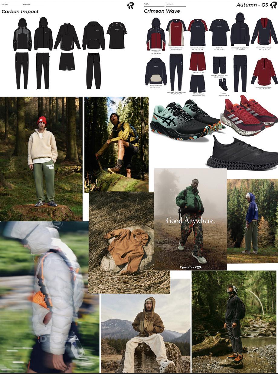 Red Run is also launching two menswear collections for autumn/winter. The manager mentioned that she wants the men’s collection shoot to take place in a forest, so I created a moodboard to capture the aesthetic. I also suggested trainers that would complement the collection, along with video content ideas and posing inspiration for the shoot.