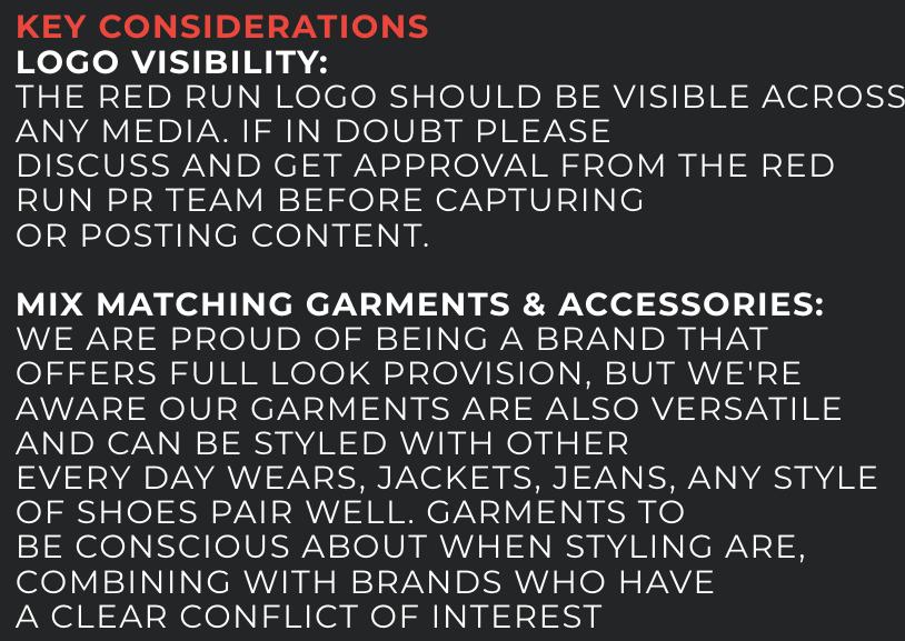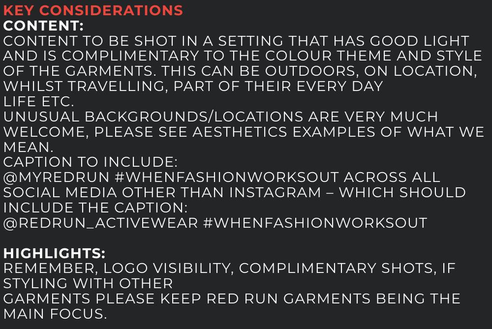 The influencer guidelines were created to introduce influencers to Red Run as a brand and outline the key considerations they should keep in mind when creating content. These included ensuring logo visibility, mixing and matching with garments and accessories, the type of content to create, and what elements to highlight. I typed up paragraphs explaining these points, with help from the manager, and then added inspiration and examples from previous influencers who had worked with Red Run to give a clear idea of the style and quality of content the brand is looking for.