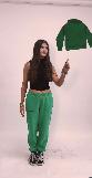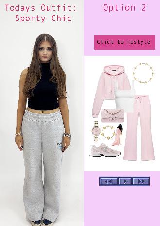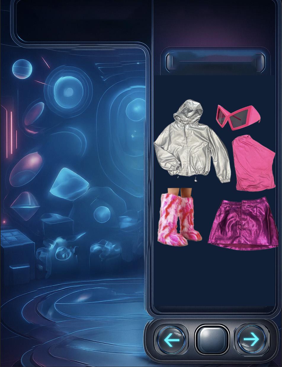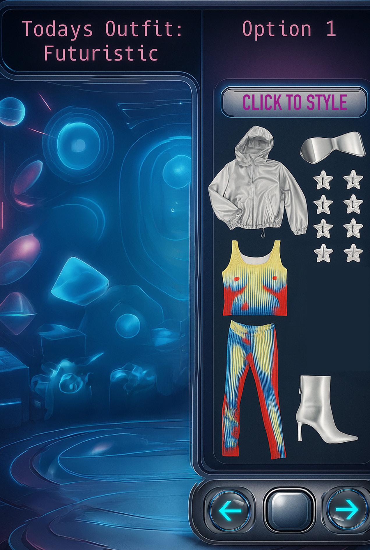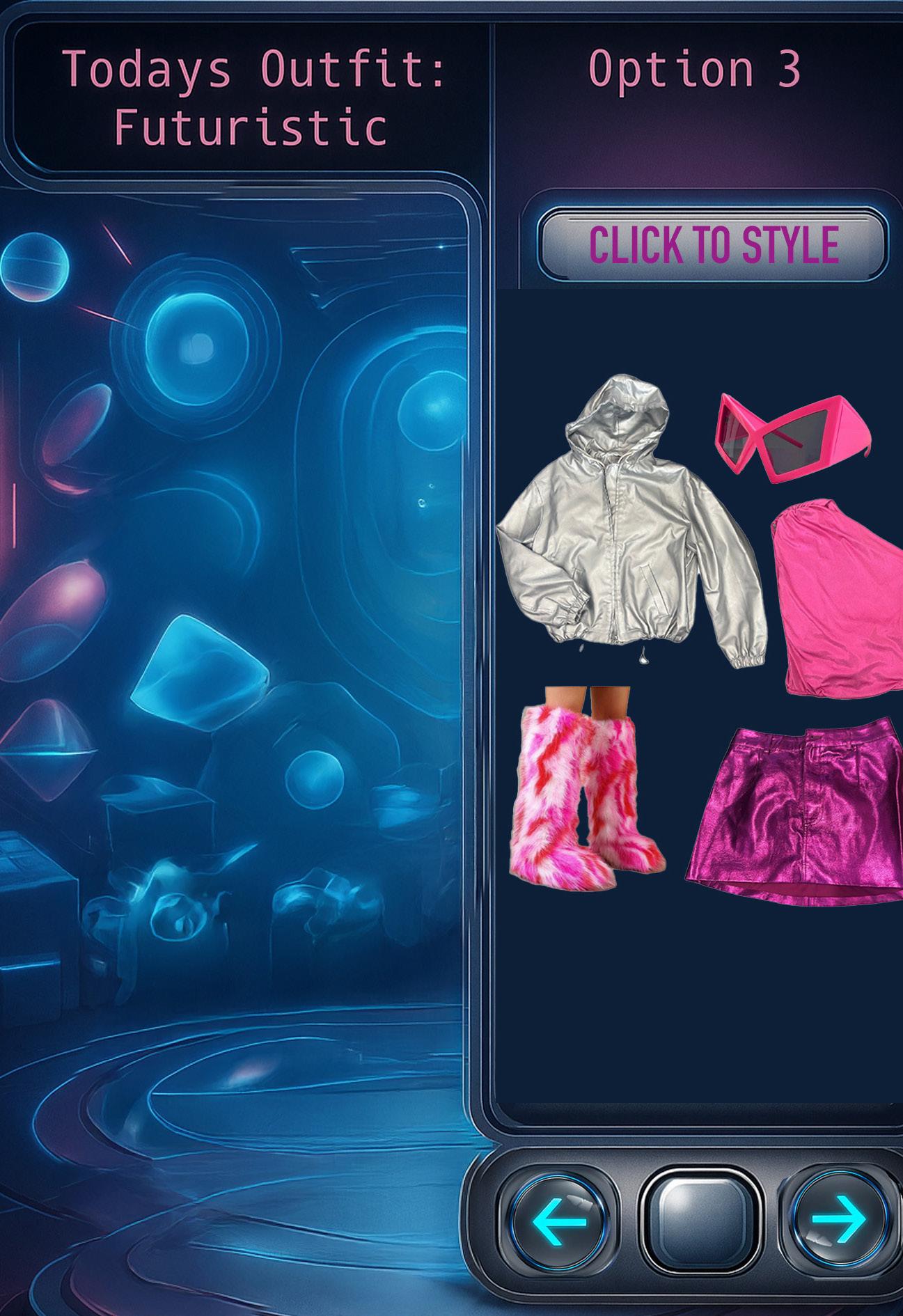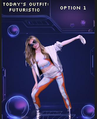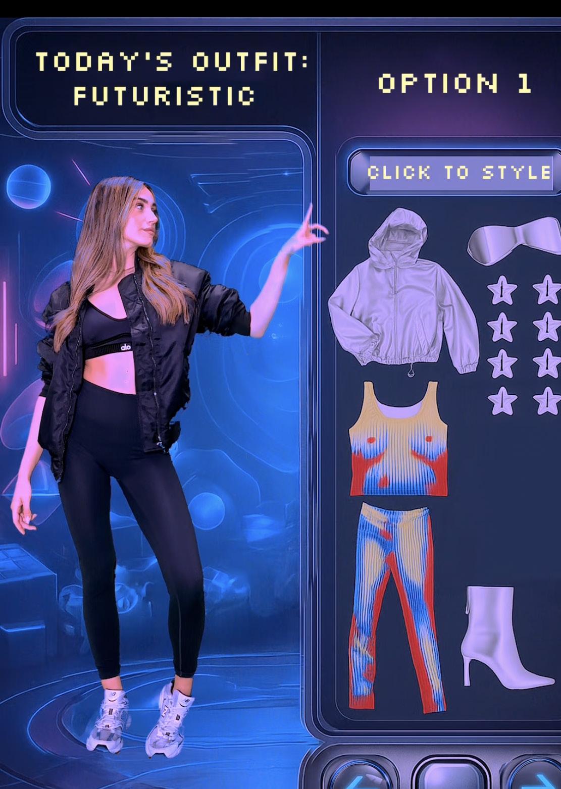 Visual: Floating 3D clothing items appear in front of her (e.g., top, bottoms, shoes, accessories).