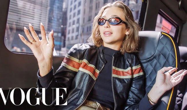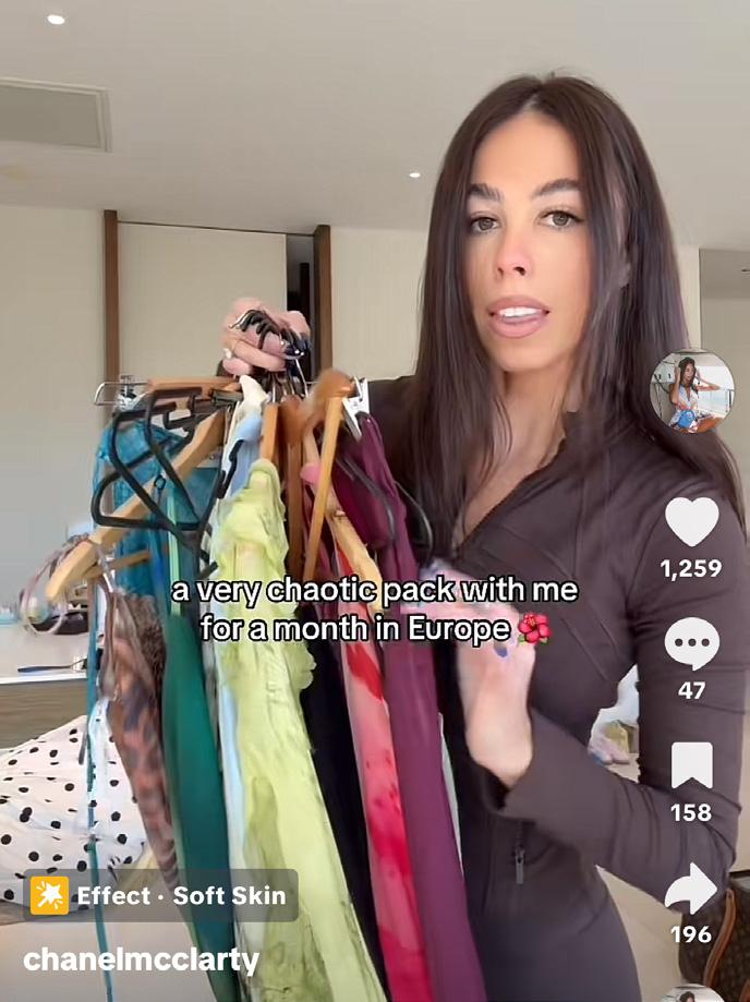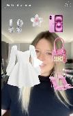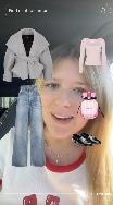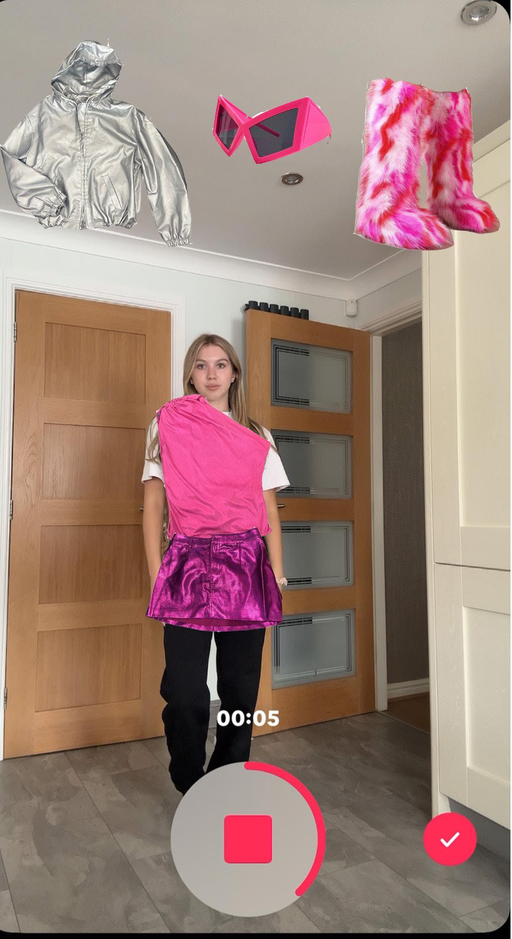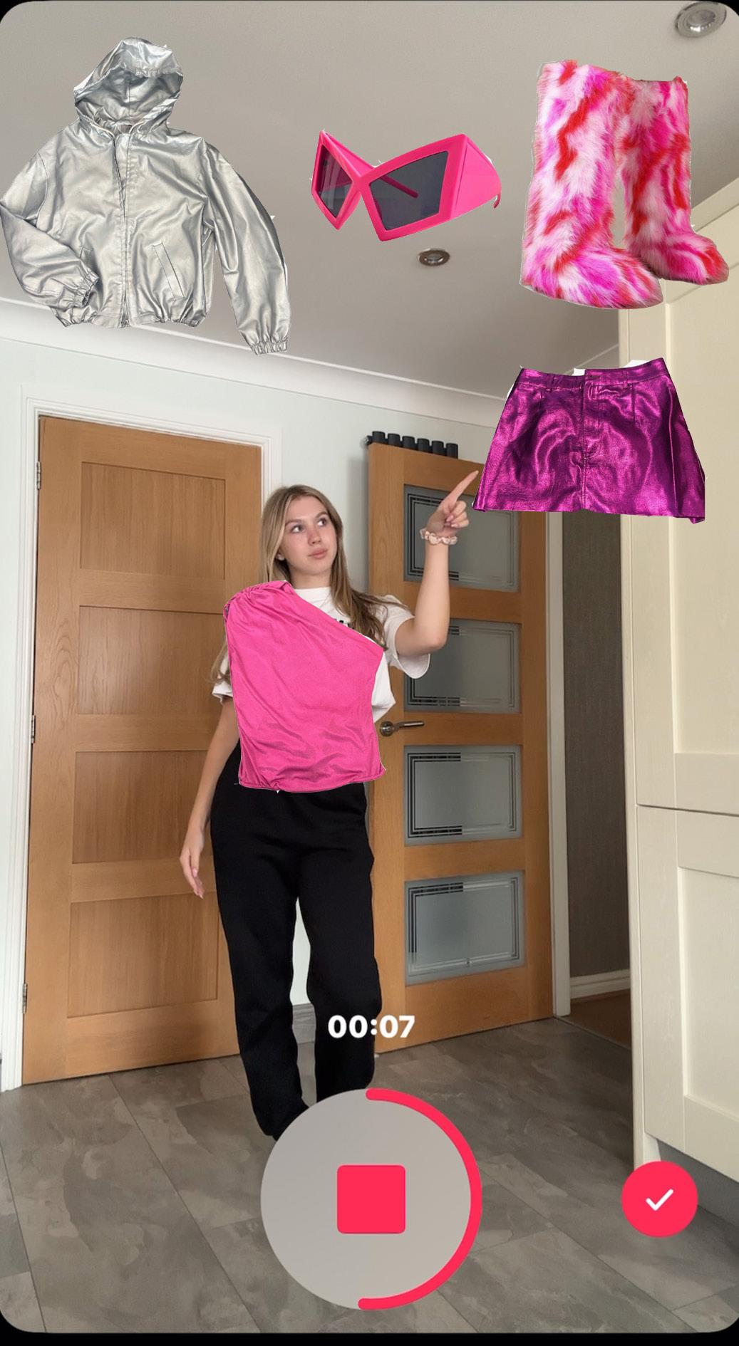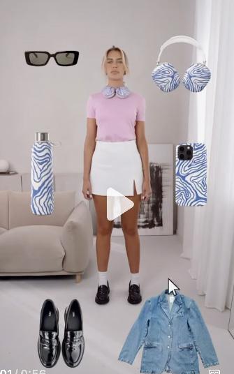 Action: She taps each item, and as she does, they appear on her body (like AR try-on).