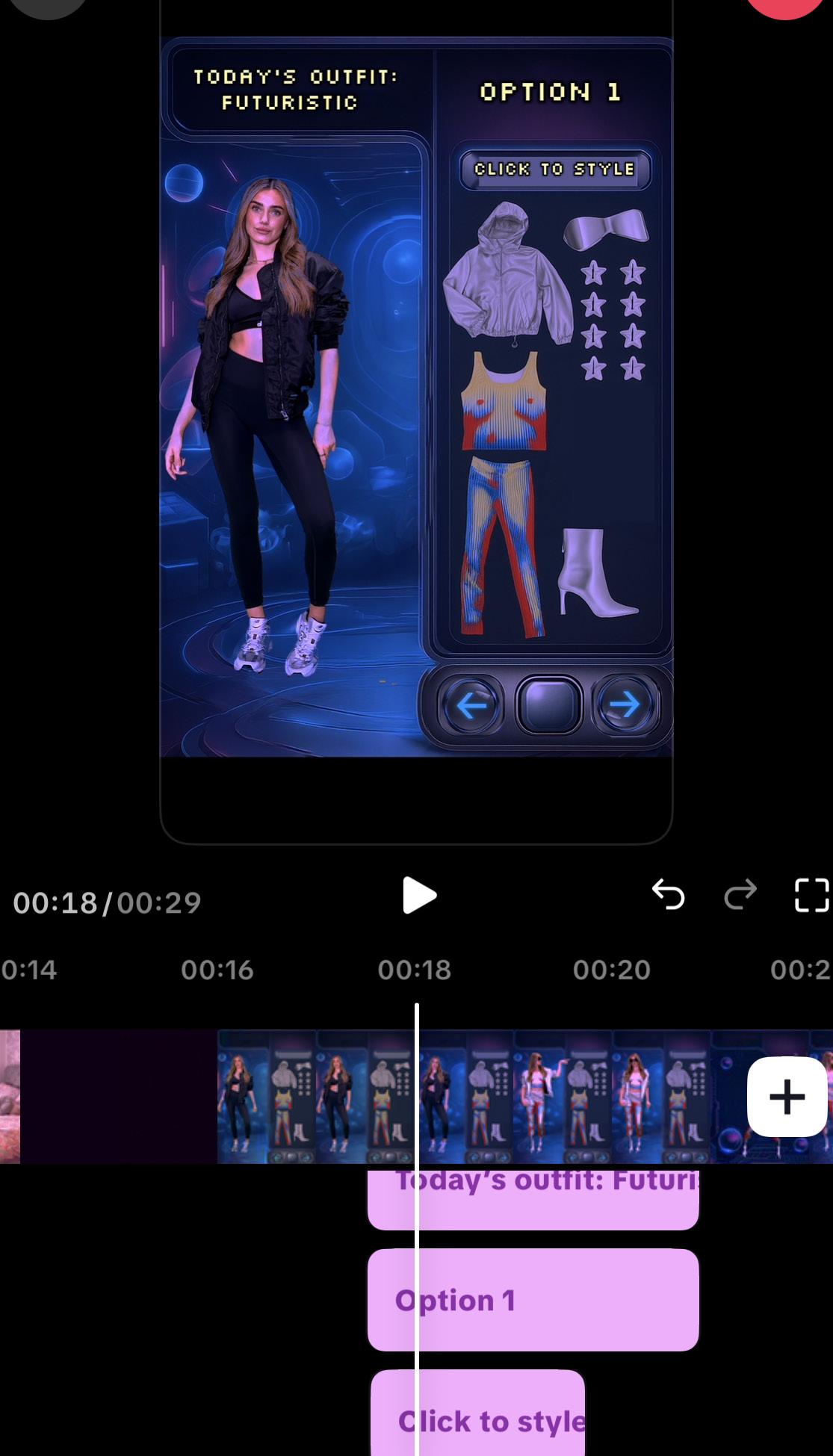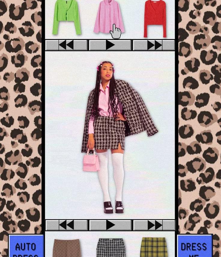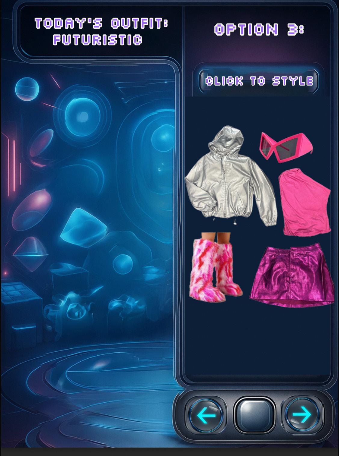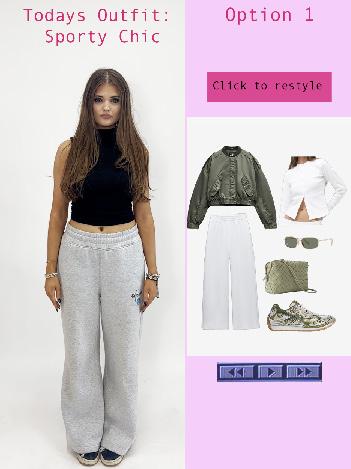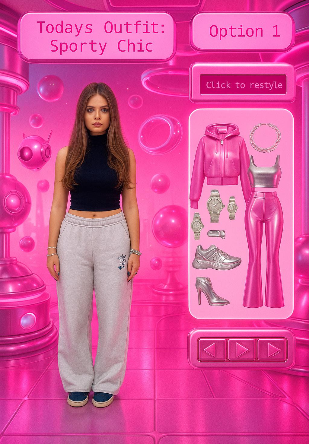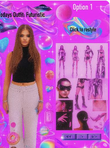 Visual: A “RESTYLE” button appears. She clicks it, and the clothing rearranges or transforms (e.g., style one of the items differently).