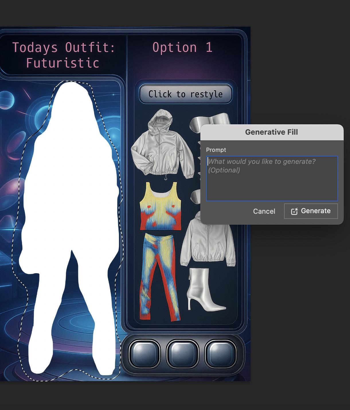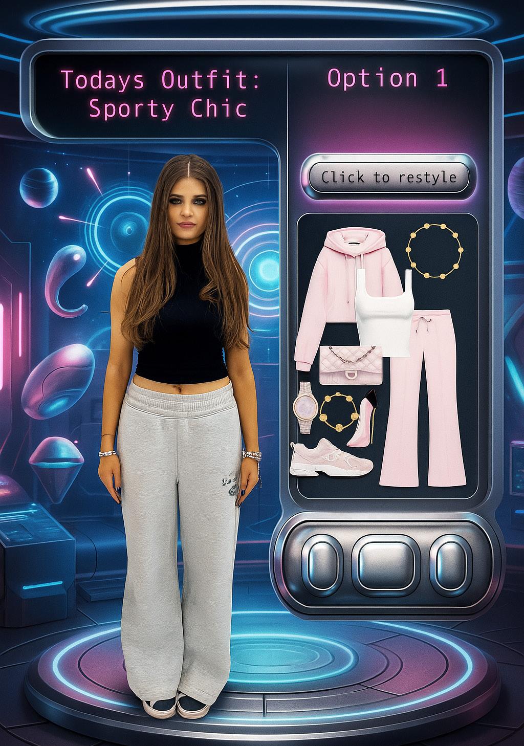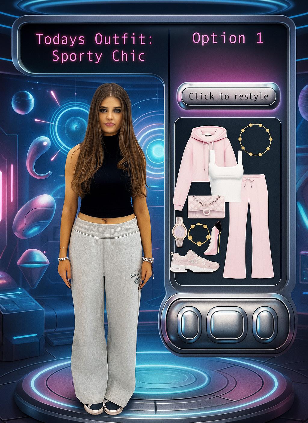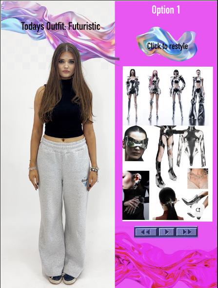 Action: New version of the outfit is generated, keeping the same itemas before bbut retyling and wearing it in a different way maybe mixing in digital fashion elements or accessories.