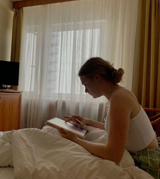 Action: She smiles confidently, gets up, and walks toward a desk where her iPad is placed.