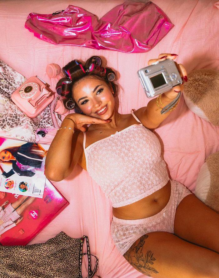 Visual: Gen Z girl in bed in a futuristic room. LED neon lights or holographic projections subtly glow in the background. She has rollers in her hair, makeup already done and in her pajamas.