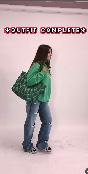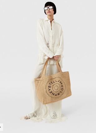 Action: Puts bag on her shoulder and walks off to the side