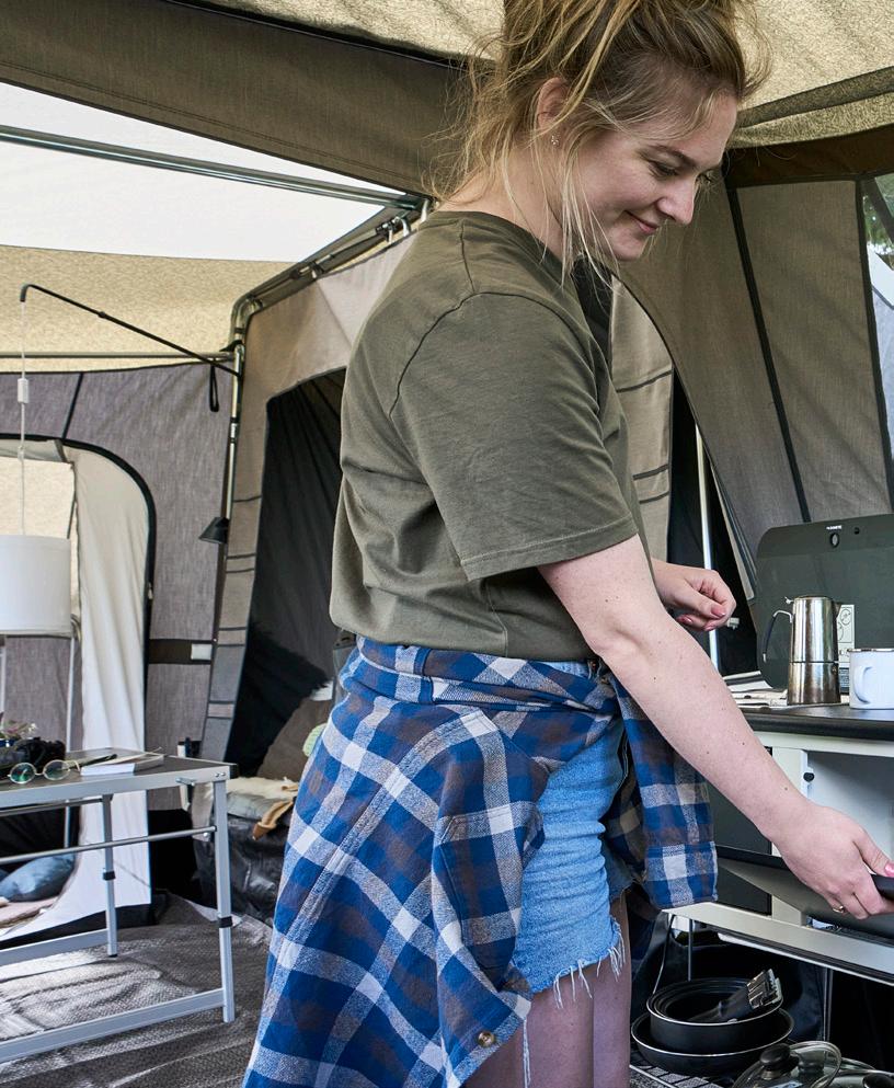 The Camp-let Earth side tent is ideal for those who want extra covered living space with good standing height on the left side of the Camp-let Earth. Do you have a kitchen in your Camp-let? Then this side tent comes in handy. It works perfectly as a covered kitchen area so you can prepare meals without worrying about the weather. The side tent can also be used as extra sleeping space, a dining area or extra storage space.