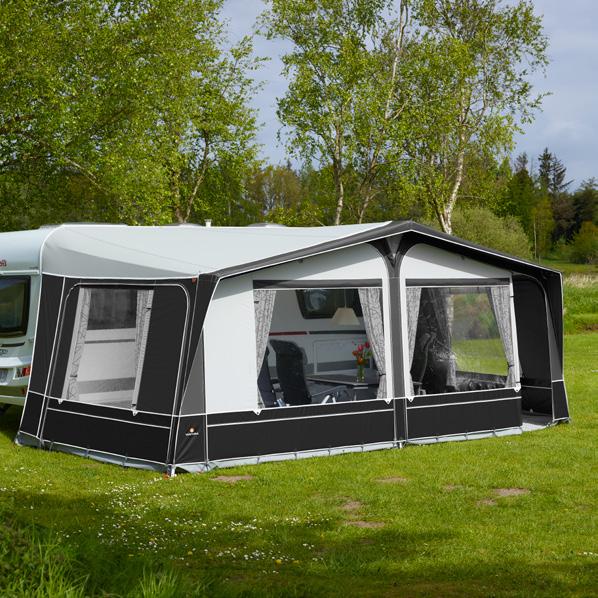 Leveres som standard med: Skruefrie FixOn-beslag, gardiner Luxor Grey, understykke, standard hjulafdækning, telttaske, stangog pløkpose.