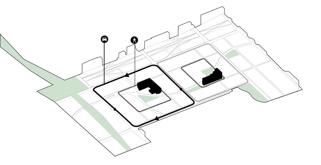 THE SITE! BRINGING CURRENT HIGHWAY BELOW GROUND UNDERSTANDING THE MAIN VEHICULAR SPINE AND THE CONNECTING PARALLEL SPINES EXTENDING PARALLEL SPINES UNTIL NEIGHBORING AREAS, CREATING MAIN VEHICULAR ROUTES WITHIN SITE