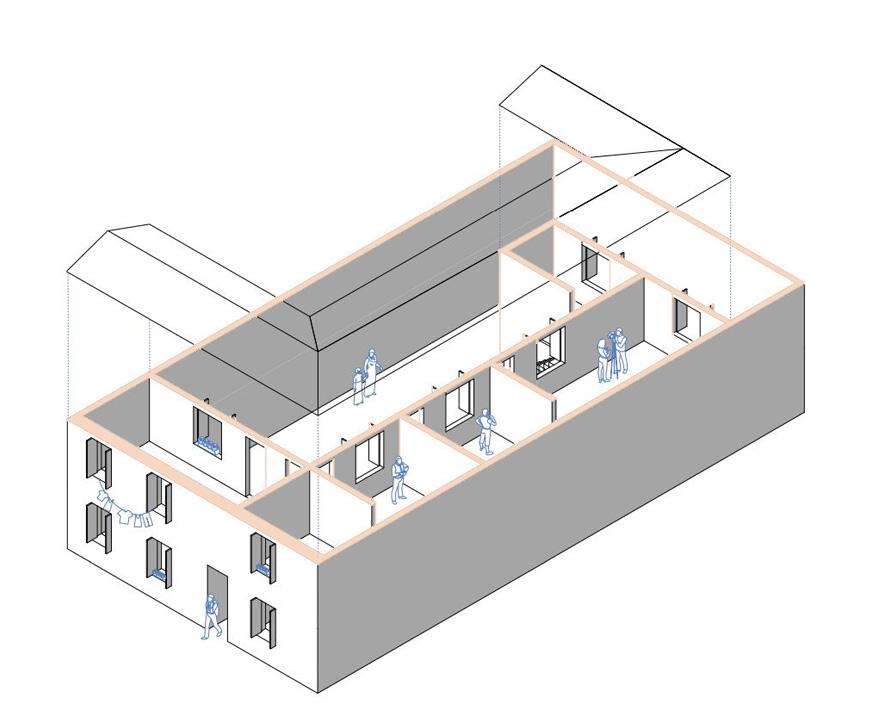 The original housing in Embajadores and within Madrid consisted of a two storey dwelling with a large back yard connecting to surrounding plots. This yard was an empty space that was used for workshops as well as orchards, with connections to the street.