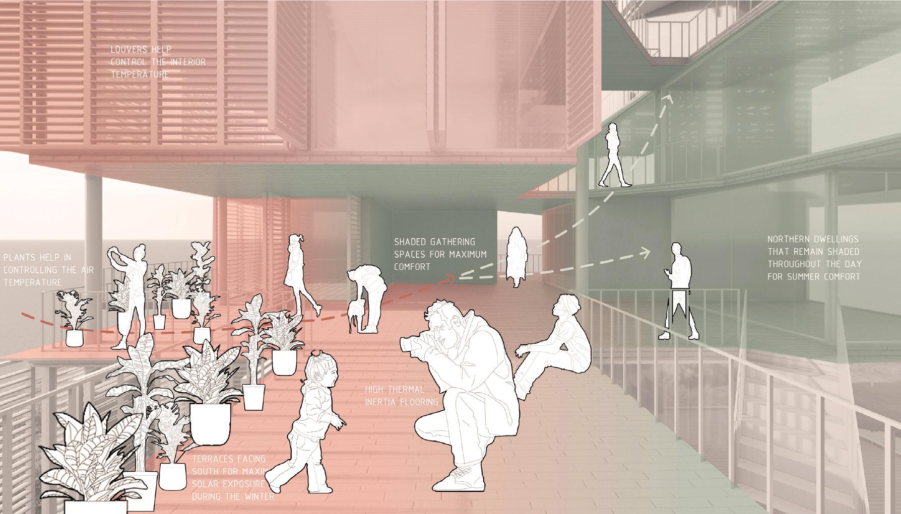 SUN PATH TOWARDS SOUTH CIRCULATION AND CONNECTION TO OTHER FACADES GRID OF 2 METERS HIGHLIGHTING VERTICAL LINES ACCESS FROM ONE END TO ANOTHER INFILL AREAS AT GROUND FLOOR LEVEL 01 HOUSING LAYOUT LEVEL 02 WITH VOID AS COMMUNAL SPACE