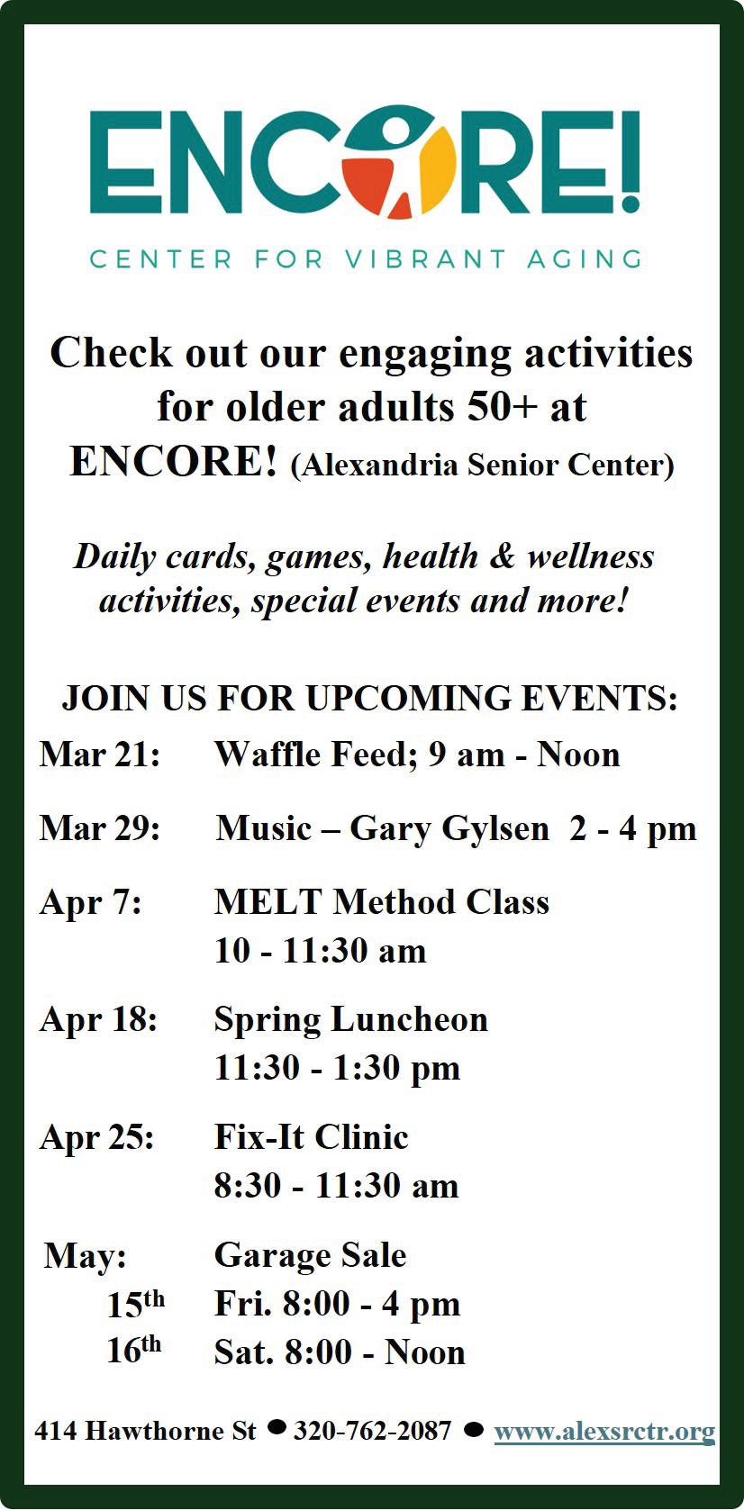 Hosted by Douglas County Senior Services along with Social Services and Horizon Public Health, you will learn about some of the choices in the Alexandria area (senior apartments, 55+ housing communities and assisted living communities). After a short informational session at the Public Works Conference Room, we will board a school bus and visit 2-3 senior housing sites. The bus will have wheelchair accessibility. Sites will be finalized about two weeks before the tour date.
