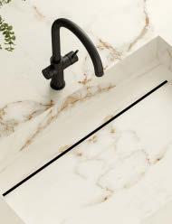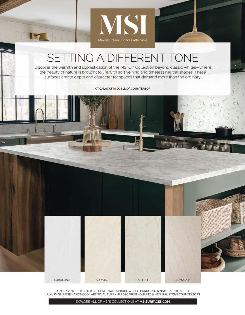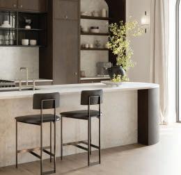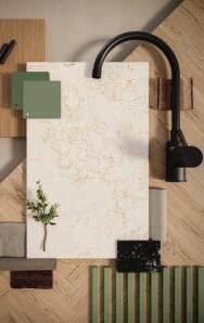 With a commitment to impeccable detail and quality, Caesarstone launched its new OOAK (One of a Kind) Quartz Collection in 2024 — a celebration of the unrepeatable nature of veining. Each surface is designed with purposeful elements, movement and depth to create a unique, personal style. The collection includes Marbarnova, a porcelain surface with silky warm white tones and dynamic taupe and gray veining and Goldfinch (pictured here), a material that dazzles with gilded veins over a pure white base and warm earthy undertones. Goldfinch’s neutral oxide accents and gradations of burnt amber echo the shifting sands of a windblown landscape. Available in 2 cm and 3 cm thicknesses, with slabs up to 130 by 64.6 inches. Learn more at www.caesarstoneus.com