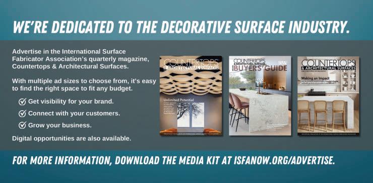 Countertops & Architectural Surfaces (ISSN 2372-9821) is published quarterly by the International Surface Fabricators Association (ISFA), with a fifth edition, a Buyers’ Guide, publishing in November.