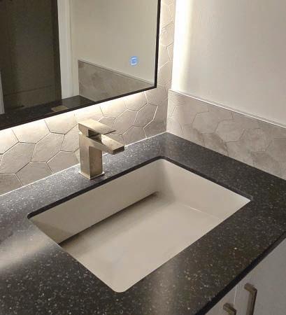 Mystera Solid Surface uses a unique manufacturing process to replicate the look of natural stone. Originally developed in the mid‑1990s, the raw material and production processes were upgraded in 2012 for higher performance and new visuals. GSP Surfaces, a U.S.‑based company, manufactures Mystera, in addition to other solid surface products, with quartz surface products produced in factories around the world. The Mystera line features 43 colors assembled with input from commercial and residential designers: eight Fusion colors and five Platinum colors (multi‑directional with varied pigmentation and vein intensity), 22 Artisan colors (some of the most popular visuals and tones) and nine Winsome colors (a cascade of linear veins with subtle color changes). Shown here is Carrara. Learn more at www.mysterasurfaces.com.
