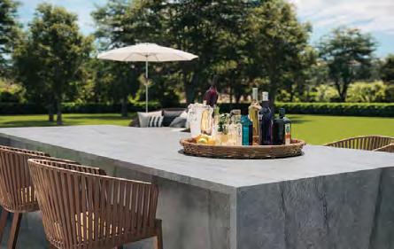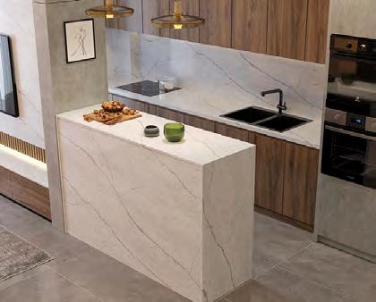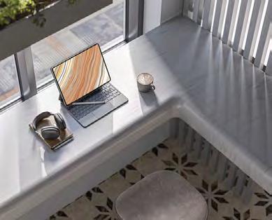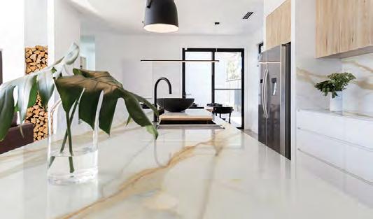 Marble surfaces are all the rage at the moment thanks to their natural elegance and the beauty of the veining. Accordingly, Coverlam Top presents the Cuarzo Reno series, a white marble transformed by rich tints in warm tones. The pieces display a crystallization with a grayish background, enriched by surface veining that evokes the oxidation caused by exposure of the material. The veining adds golden glints that give the pieces a luxurious and exclusive look. For lovers of the marbled look, infinite veining and the properties of technical porcelain, Coverlam Top’s Cuarzo Reno series is the ideal choice, endowing rooms with elegance and personality. Learn more at www.coverlambygrespania.com/en/catalogo/ cuarzo-reno-cov/?product-cata=230.