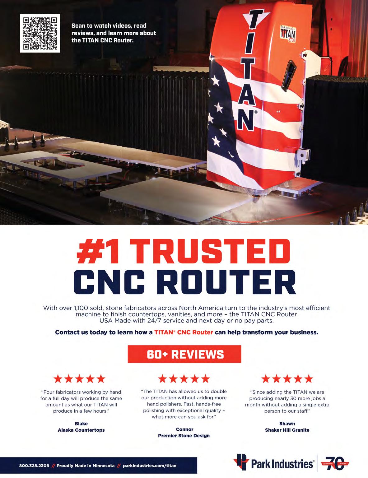 It’s crucial to be forward-thinking and innovative — discover new ways of doing things, like filling vacancies on your staff (page 20) or partnering with those across the industry to further sustainability (page 34). In this issue’s fabricator profile, read about Adobe Walls Stoneworks, a first-class fabrication company out of Amarillo, Texas, that upped its showroom game and saw big returns (page 40).