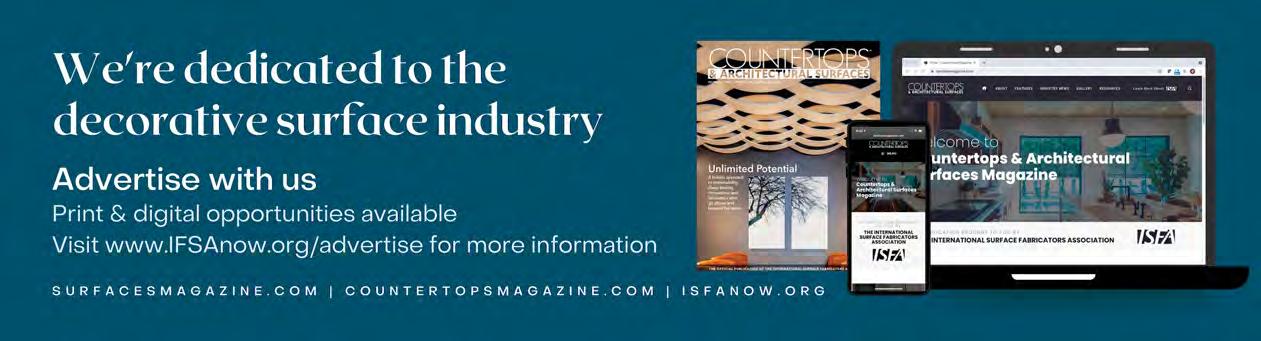 Countertops & Architectural Surfaces magazine is proudly printed in the United States of America. Copyright © International Surface Fabricators Association 2023. All rights reserved. No part of this publication may be reprinted or otherwise reproduced without the publisher’s written consent.