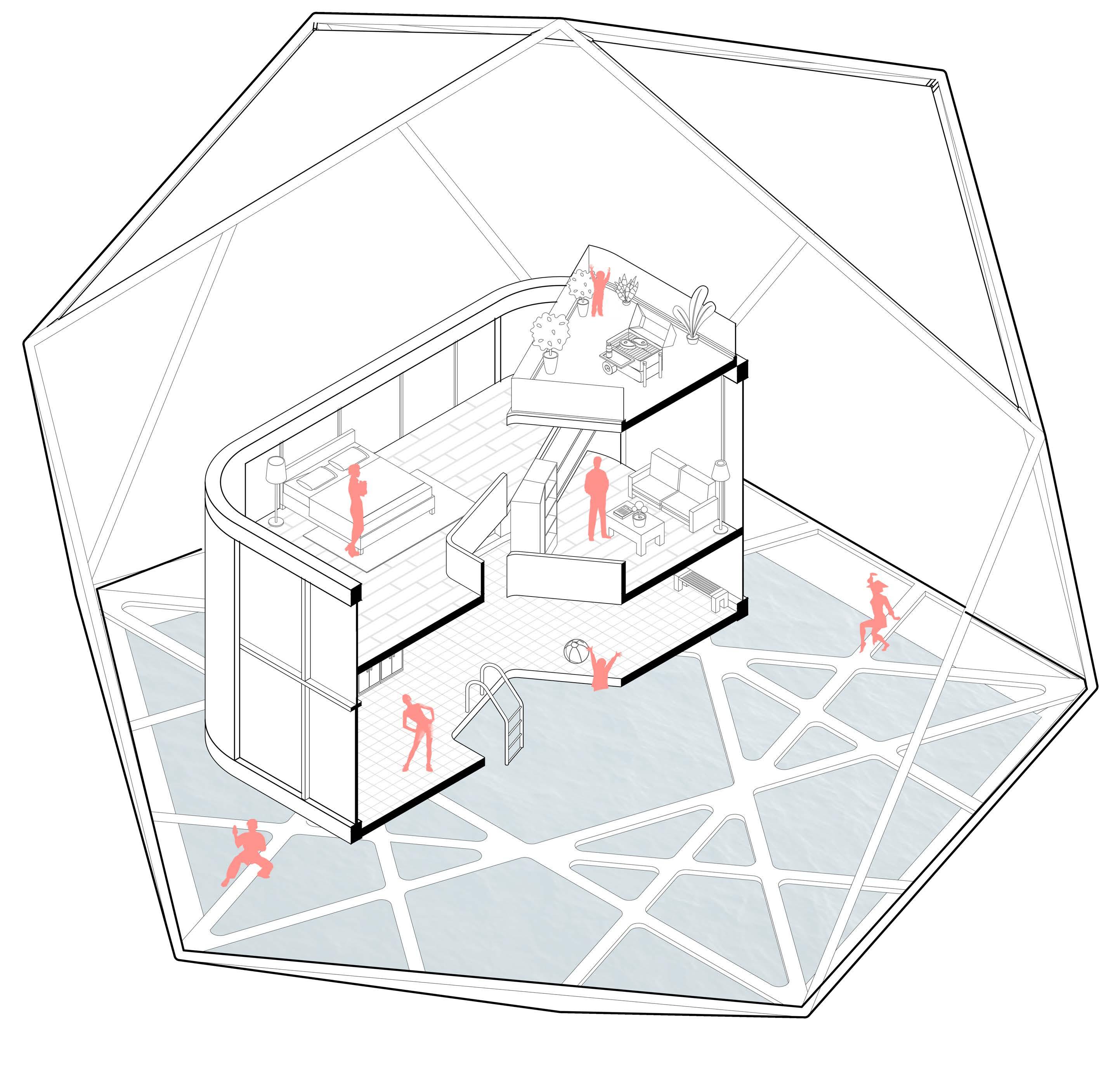 The module is independent of the site. The collapsable floor slabs and foldable exoskeleton allow one to relocate the pod efficiently.