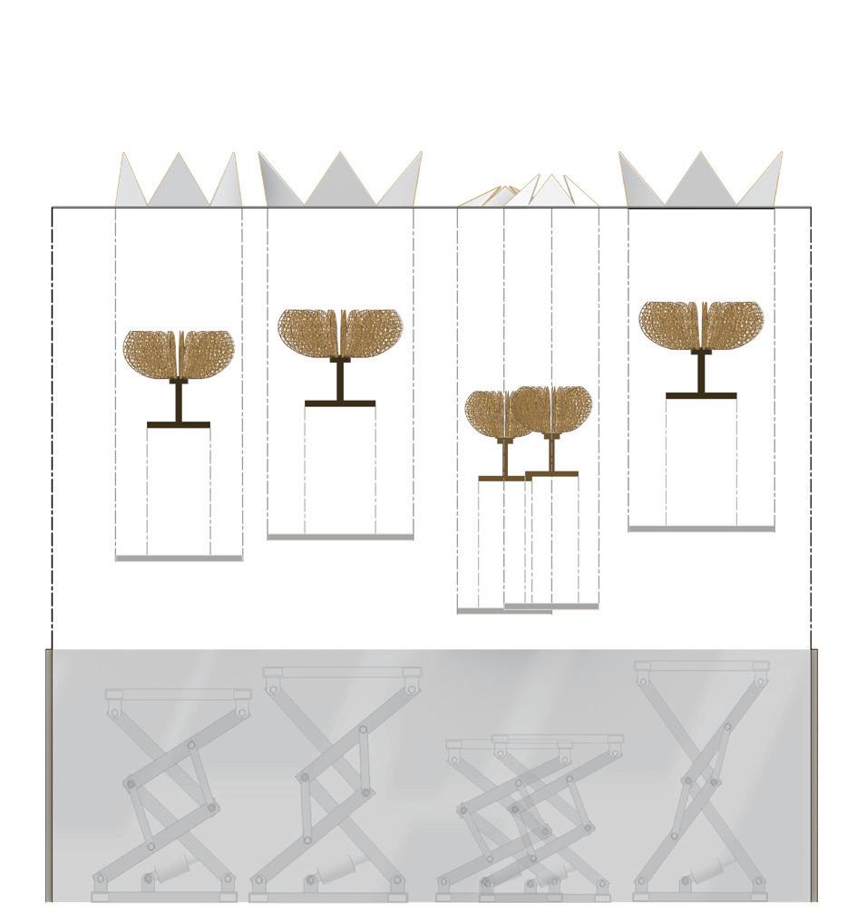 agricultural goddess Demeter, stopped the growth of plants when her daughter was kidnapped, and everything revived when her daughter returned. My design for the architectural installation incorporates the initial ascending system, which symbolizes the emergence of plants from the soil.