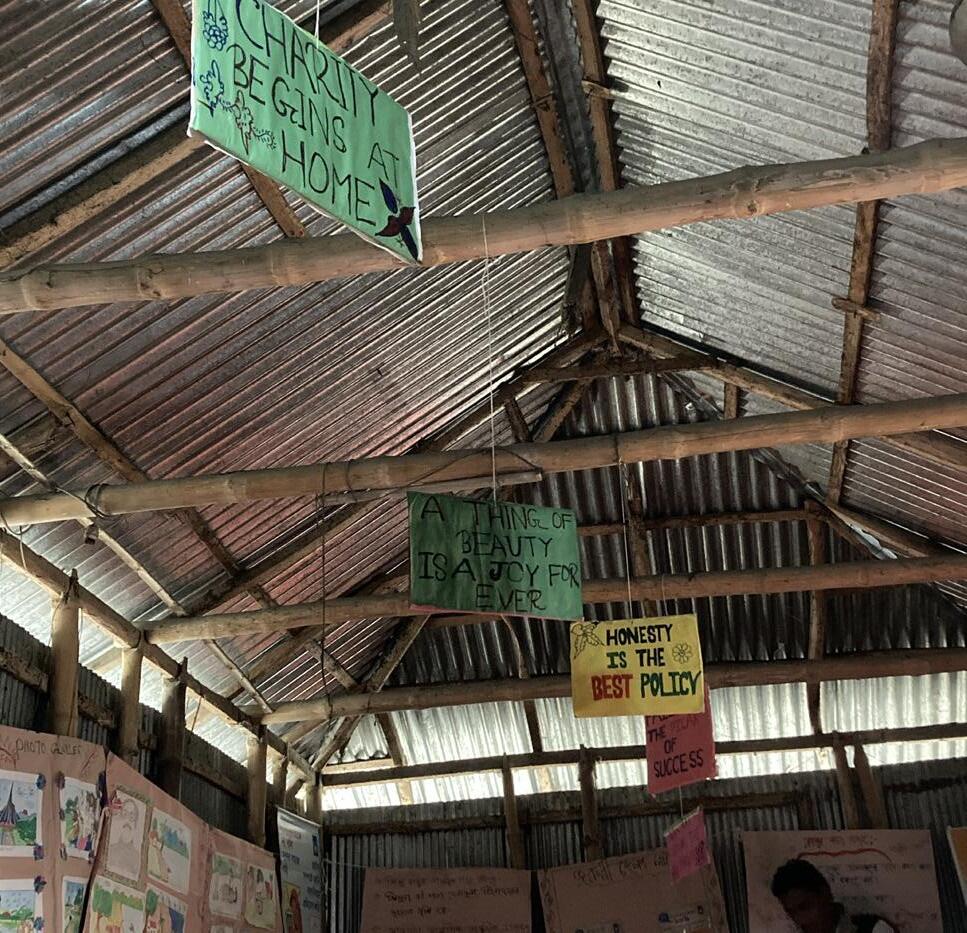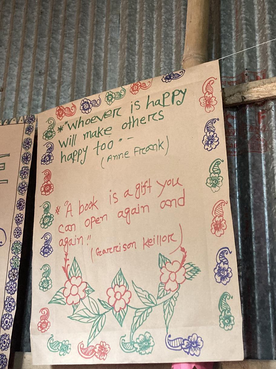 Posters depict learnings on child rights, referral mechanisms, and motivational quotes.