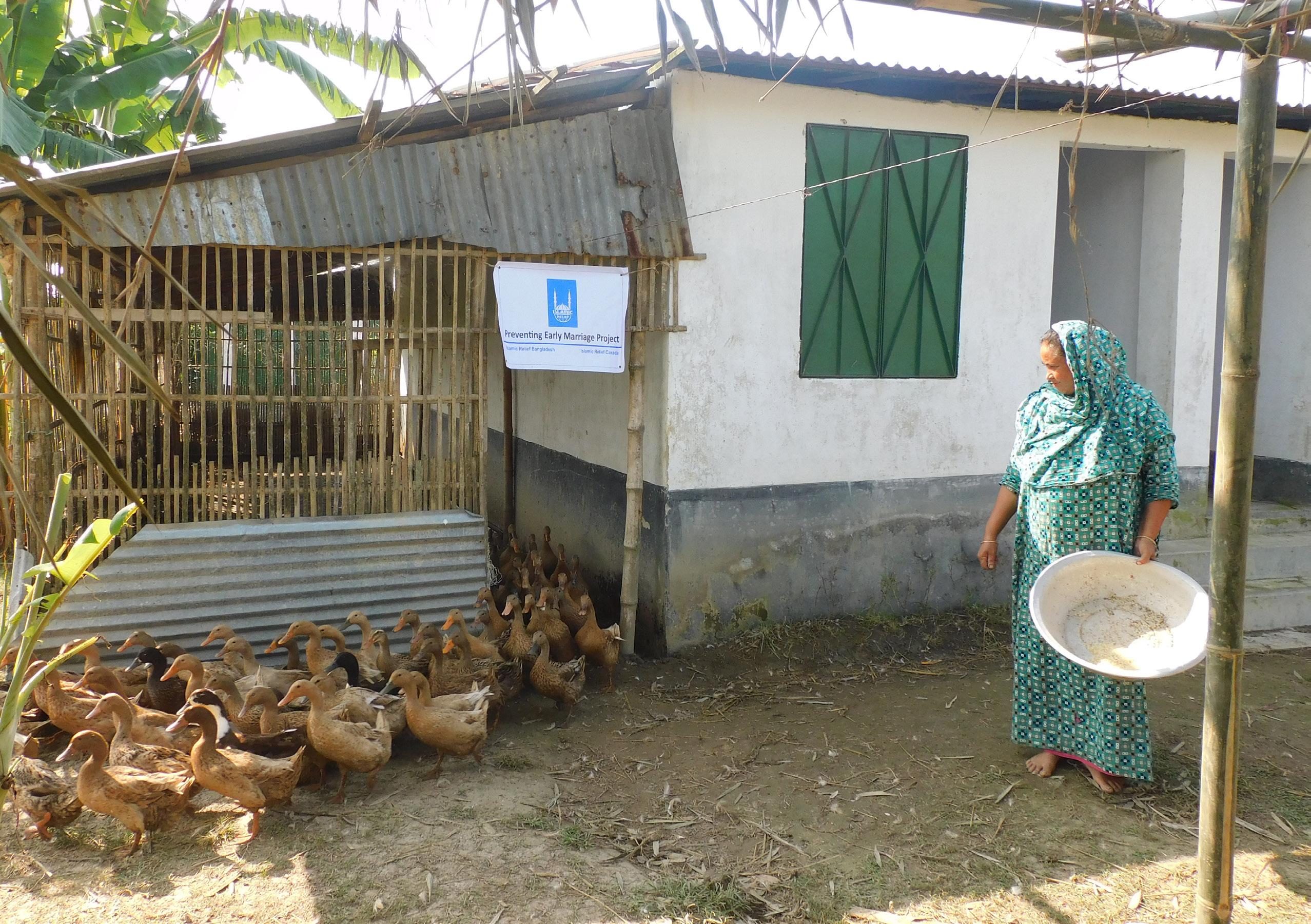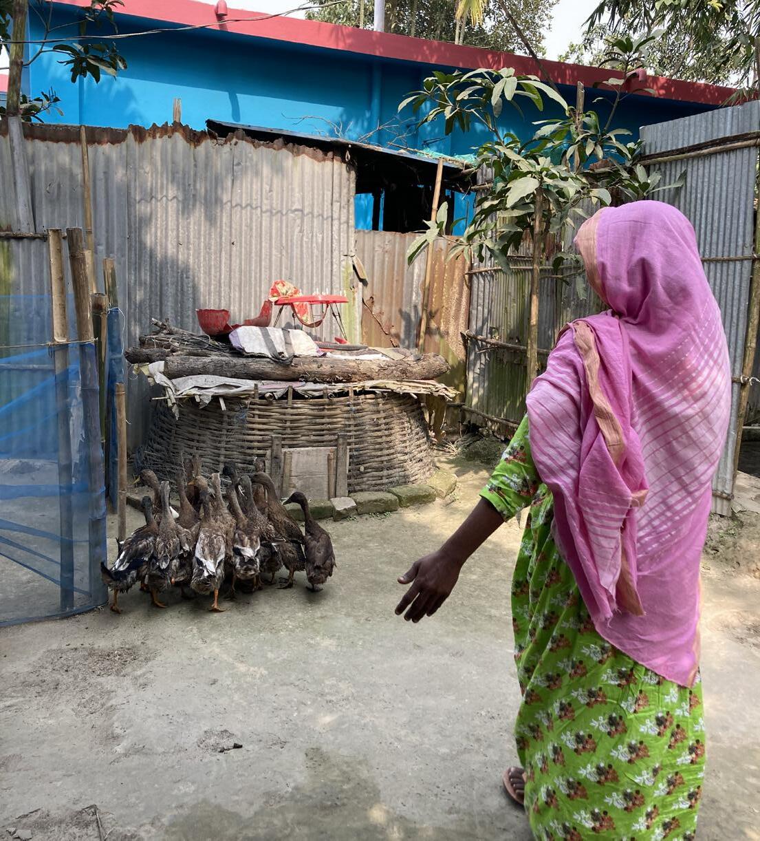 Syeda is a mother of two bright young daughters, both she and her husband are unable to read and struggled to provide for their family.26 Syeda and her elder daughter, Shireen were both selected as rightsholders for the PEMB project. Syeda joined the local self-help group and learned how to raise livestock. With her cash grant and a loan from the group, she purchased 150 ducks that she raises. By selling the duck eggs, she is now able to earn an income of BDT 600-700 ($7 - $8 CAD) per day. Now, she can afford to send both her daughters to school.