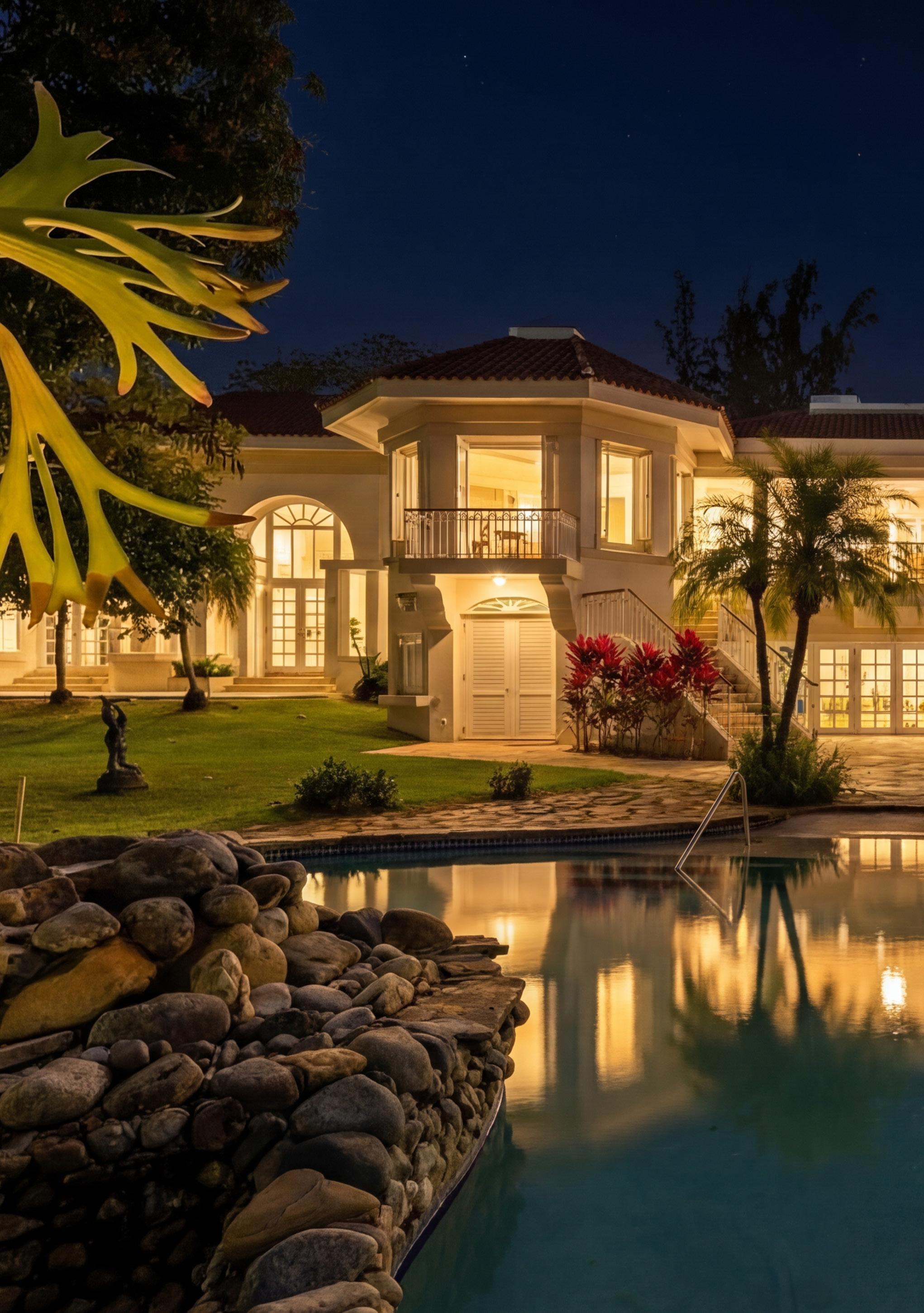 “At Villa Tranquility, life unfolds gently. Set within the lush, tree-lined streets of Dorado Beach Estates, this residence is designed to feel open, calm, and connected to nature. Sunlight filters through palms, reflections move across the pool, and every room invites the outdoors in.