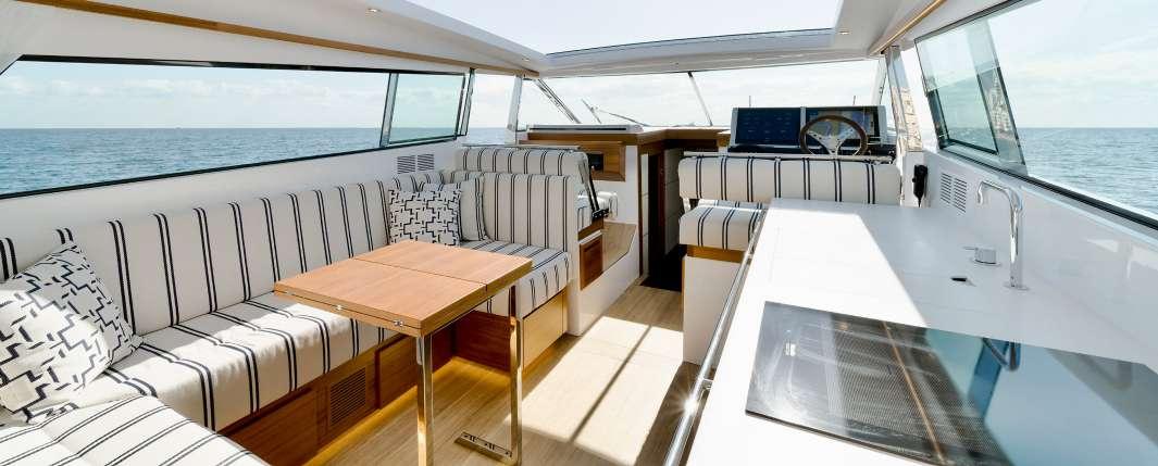 The layout has been thoughtfully designed for both private cruising and entertaining. Generous lounge areas, a spacious galley, and a well-appointed helm station create a seamless