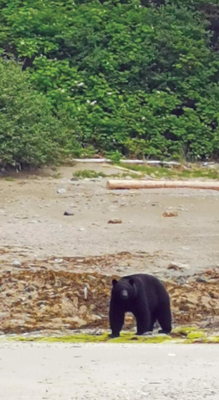 location as well as a picturesque one, set for defensive reasons “between the rugged outer coast and the protected inner waters of Barkley Sound.” Today there’s a bear waiting to greet us as we reach the sand. We keep a respectful distance, and the bear eventually wanders off—into the very section of the forest where Stella was planning to lead us. While we wait for the bear to wander a little further, we take out our packed lunches and have a quick picnic.