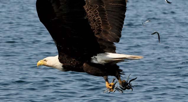 Eagles can see over a distance of three kilometres — hence the expression “eagle eye”. Relying on their keen eyesight, eagles perch in distant trees to watch sea activity below. When fish rise to the surface, evading predators beneath them, the eagle is ready above.