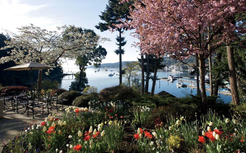 a bove: the centrepiece of hastings house hotel is an 11th century Sussex-style manor that combines old World elegance with a distinct g ulf islands influence. facing page: g uests at hastings house can unwind on the hotel patio with an expansive view of g anges harbour.