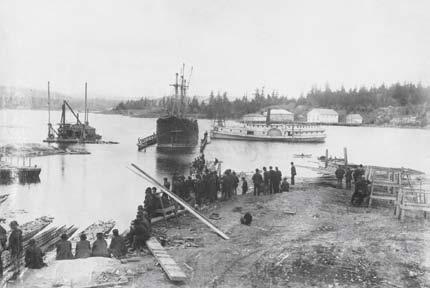 top left: the first photograph taken of what is now yarrows ltd., established in 1894 by W. f.Bullen. Vessels in the photo are the barge, robert Kerr, and the paddle steamer isabel. top right: launching of hMc S Beacon hill at yarrows ltd. no. 1 yard. november 6, 1943. Below: Bc ferry Queen of nanaimo at Burrard Dry Docks, north Vancouver, being lengthened to accommodate more cars and passengers. Photos courtesy of the Maritime Museum of British columbia.