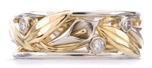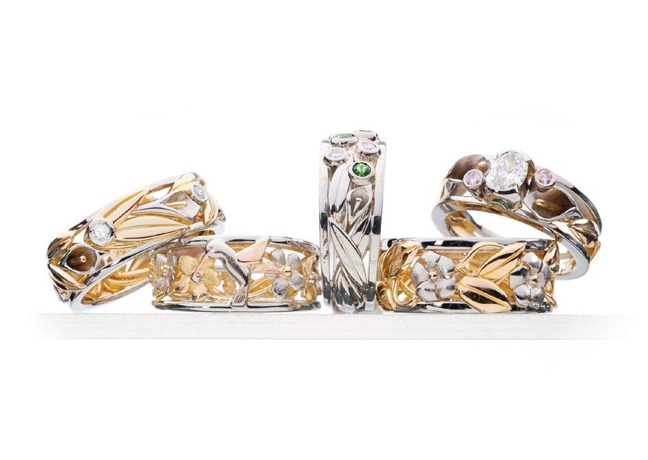 There are a few reasons why. For our rings with fine floral structure like our Calla Lily rings, we use yellow gold or red gold for the flowers, but you need something strong to hold it all together, and the 19K white gold we use is very strong and durable. I also like to use the three colours, because if you cast a ring, you can usually only use one colour and casting is far inferior to handmade. But if you forge something and hammer it out by hand, you can incorporate the three colours of gold and give it a lightness yet make it wearable. First and foremost, it’s about the aesthetics, but it’s also about making pieces that can be worn.