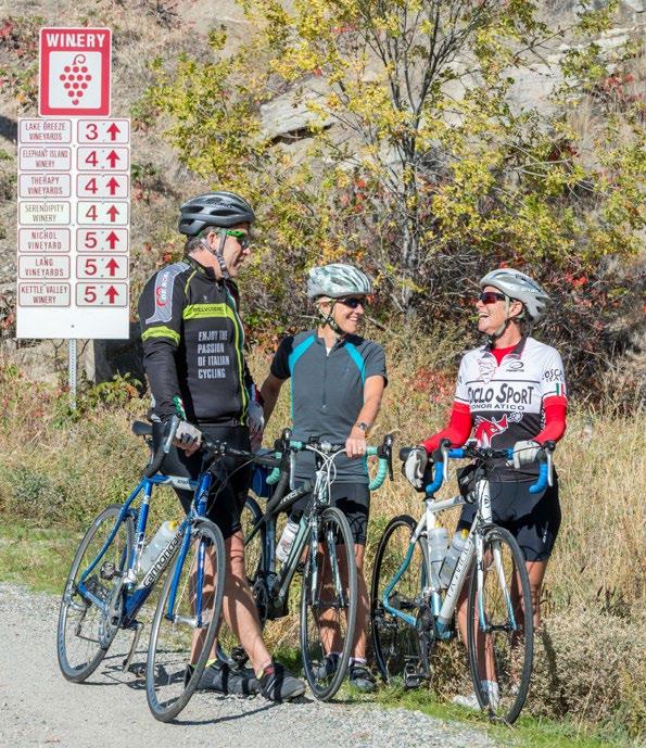 tended by hand. The scenic Kettle Valley Rail Trail is an excellent way for cyclists to explore a variety of wineries in Summerland, Penticton and the Naramata Bench. Gustav Allander, winemaker at Foxtrot Vineyards, racks Chardonnay into barrel in the winery’s cellar.