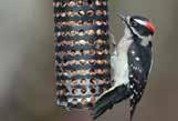 Downy woodpeckers are the smallest species of woodpecker in Canada and they are known for their acrobatics and willingness to balance on almost any type of feeder. Both male and females have black and white checkered wing feathers but the males can be distinguished with their flash of red on their crowns.
