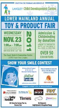 A great way to do your Christmas shopping while supporting a local service for families! The Lower Mainland Annual Toy & Product Fair provides parents the opportunity to buy new toys, products and services for their children from more than 50 exhibitors. Admission and childminding by donation; benefits the programs and services of Langley Child Development Centre. Don’t forget to enter the Show Your Smile Contest. The winning photo will appear on the cover of WestCoast Families Magazine! www.langleycdc.com