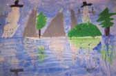 7. Paint the sky and reflected sky with watercolour paint. The wax crayon will resist the paint.