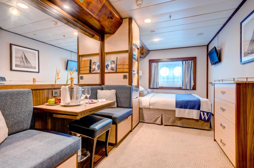 Windstar Cruises specialise in small ship cruising They provide an intimate experience that won't see you crammed in with a couple of thousand other passengers In fact, at 100 per cent capacity, the Wind Spirit caters to just 148 guests in 73 deluxe, oceanview staterooms, plus 1 deluxe Owner's Suite that comes with queen beds and its dining/sitting area.