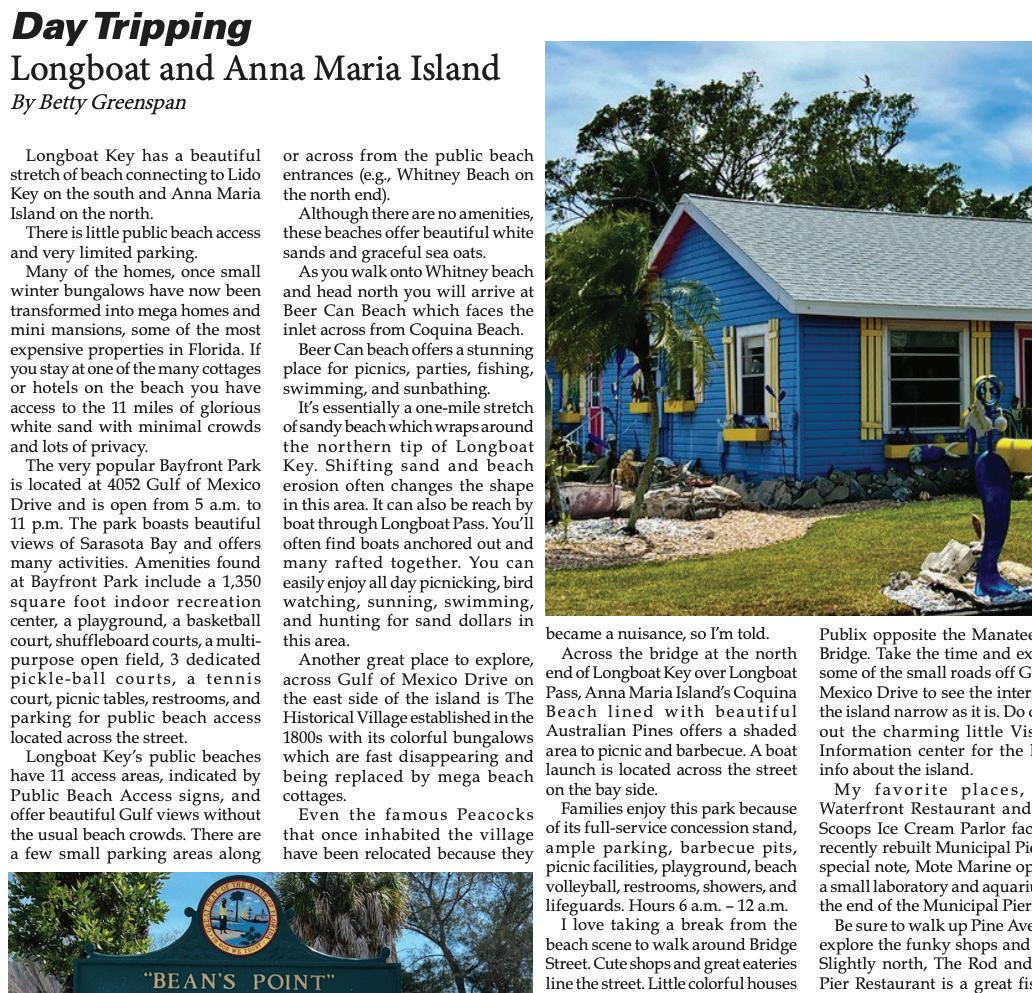 To advertise in print or on-line call 941-312-0665. Advertising Representatives: Irene Brooks and Brion Palmer. Please note that contributing writers and photographers are acknowledged with bylines accompanying their submissions. We sincerely thank everyone for their contributions.