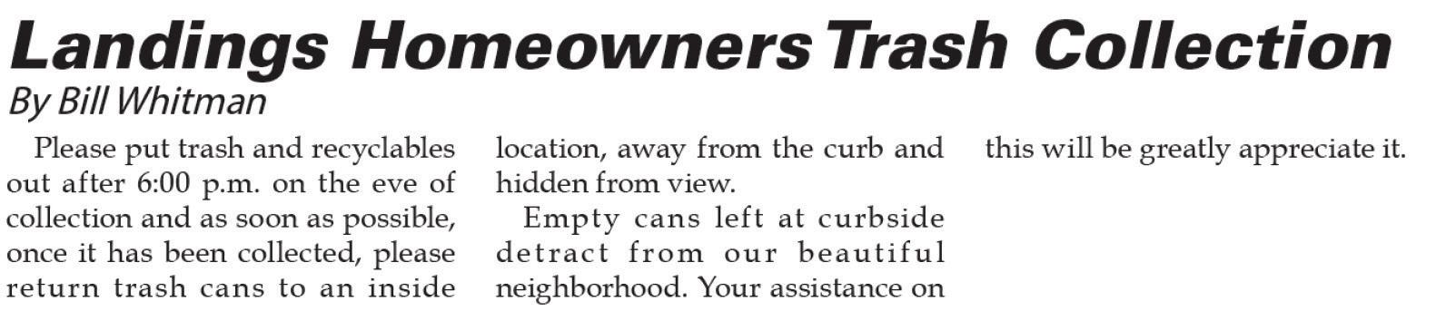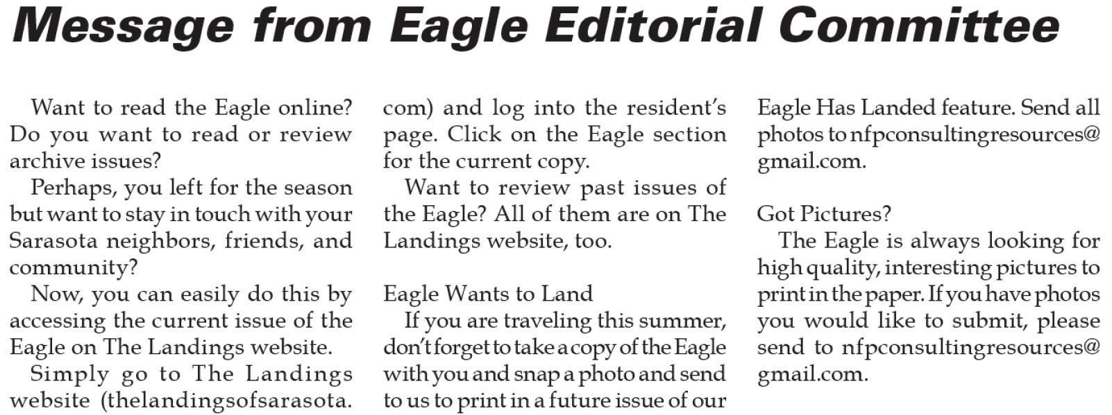 The Landings Eagle is published monthly and is partially funded by The Landings Management Association & Landings Racquet Club, but is independently edited and reported by Landings residents. The Landings Eagle is published by 27th State Media, LLC, a Florida LLC. Advertising rates and information will be gladly furnished by calling 941-312-0665, We are ready to answer your questions and to assist you in preparing your ad at no extra charge. All advertising and editorial content is subject to editing to conform to our style, and is copyrighted 2020 by 27th State Media, LLC and may not b e reproduced without written permission from the publisher. Violators will be prosecuted under federal law. The publisher reserves the right to edit or reject copy for any reason. 27th State Media, LLC is not responsible for any claims made by the advertisers.