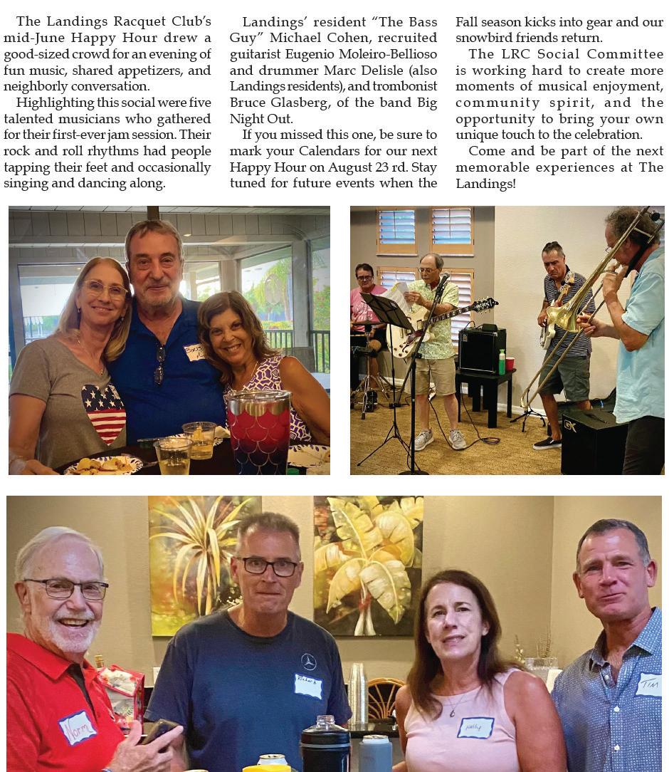 The Landings Racquet Club’s mid-June Happy Hour drew a good-sized crowd for an evening of fun music, shared appetizers, and neighborly conversation. Highlighting this social were five talented musicians who gathered for their first-ever jam session. Their rock and roll rhythms had people tapping their feet and occasionally singing and dancing along.