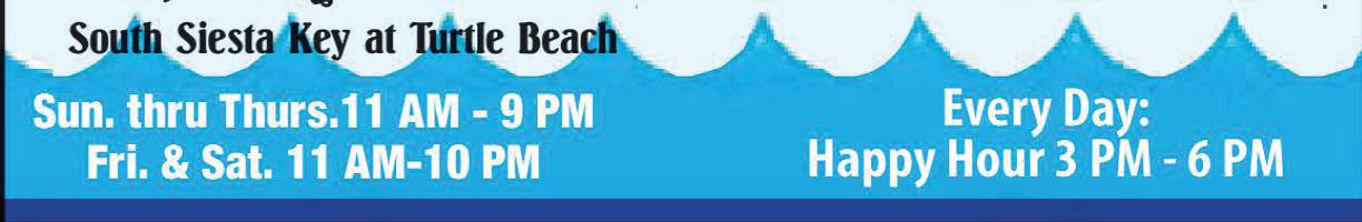 22 The Landings Eagle www.islandvp.com JULY 2023 941.312.0665 Complimentary shuttle service to and from anywhere on Siesta Key. 7 days a week from 10 AM to 11 PM. (driver tips only) • 114 Guest Rooms • One and Two Bedroom Suites Now Available • Complimentary breakfast included with every stay • Free Shuttle Service to and from Siesta Key every day. • Microwave/Fridge in every guestroom HOURS: Sunday - Thursday 2:00 PM - 8:00 PM Friday & Saturday 2:00 PM - 10:00 PM Happy Hour 3:00 PM - 6:00 PM Open to the public Live music Thursday thru Sunday starting at 4:00 PM (check the schedule on Facebook or call 941-924-4900) *Amenities and services may be adjusted due to COVID-19, please contact the hotel or visit our website for details *Use of the pool for Registered Guests Only 6600 S. Tamiami Trail Sarasota BestWesternSiestaKey.com 941.924.4900 Still Family Owned and Operated Since 2007 AAA-3 Diamond Property